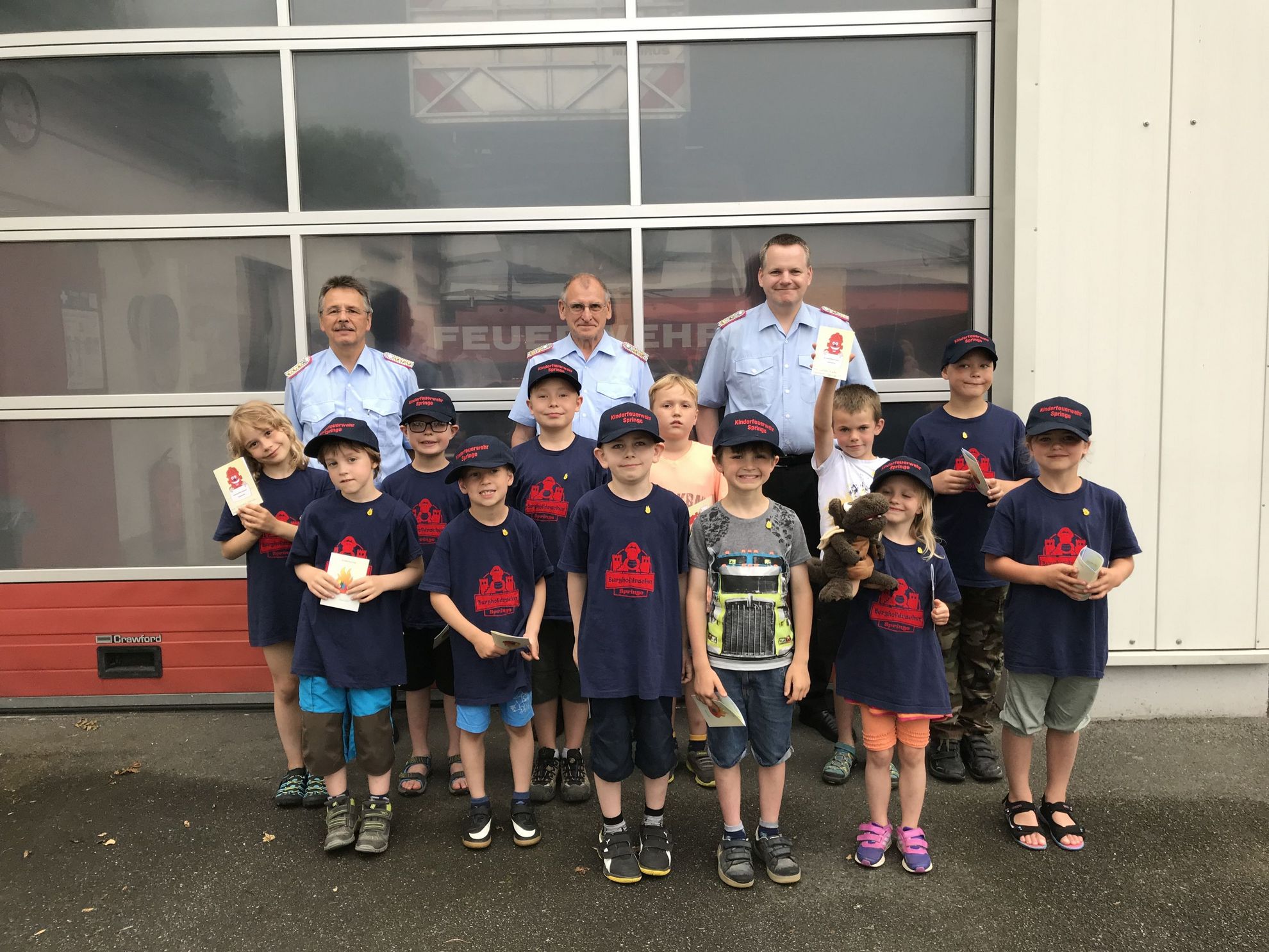 Als Prüfer fungierten Stadtbrandmeister Herbert Tschöpe, Ortsbrandmeister Florian Doege sowie der ehemalige Ortsbrandmeister und Ehrenmitglied Rudolf Lasanke. Die drei altgedienten Feuerwehrchefs waren sichtlich begeistert vom Wissen und Können der kleinen Nachwuchsfeuerwehrleute und konnten allen Kindern am Ende zur bestandenen Prüfung gratulieren.