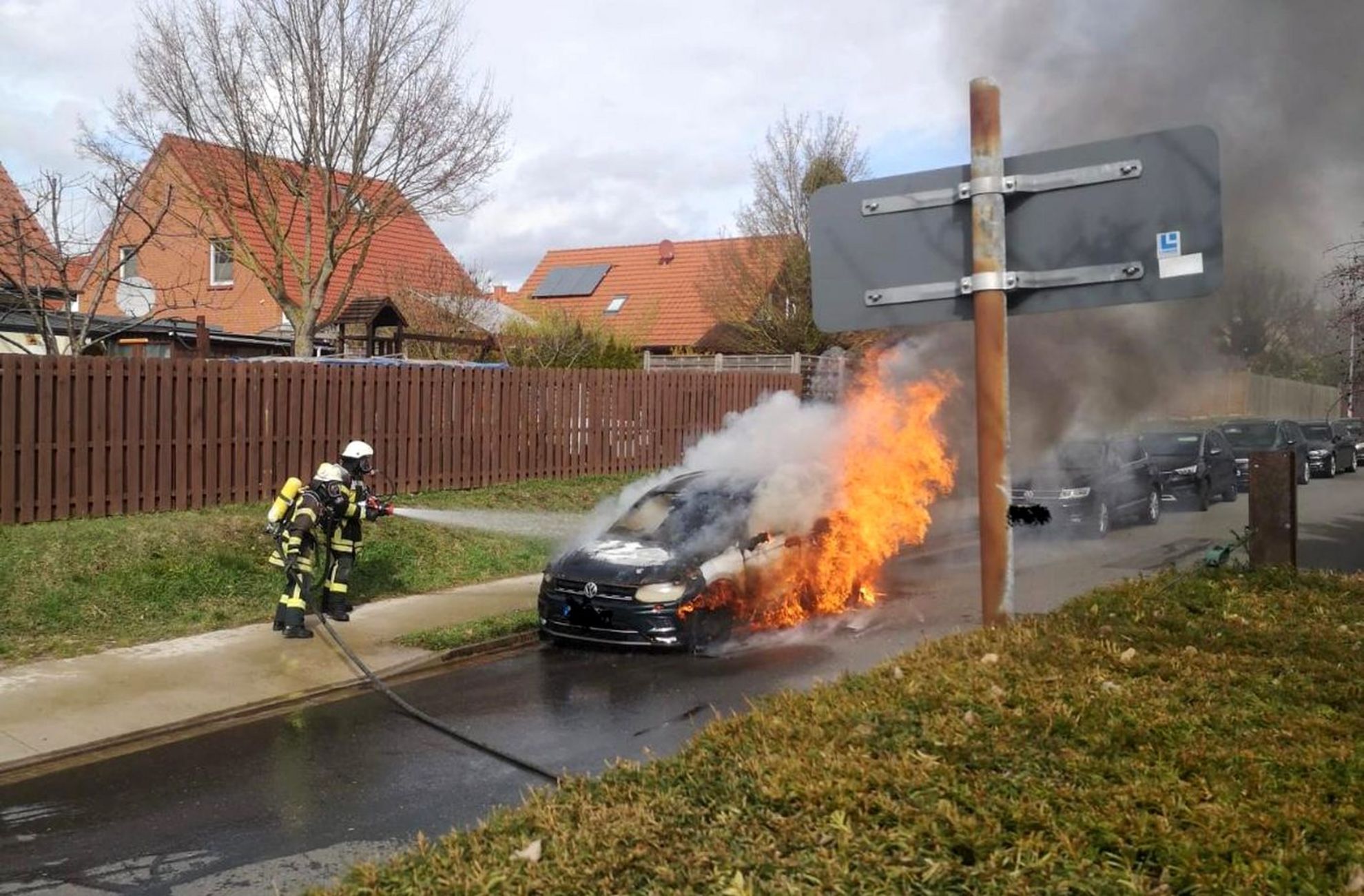 Um 12.42 Uhr wurden die Kameraden dann zu einem brennenden PKW im Ort gerufen. Auf der Straße Am Brink stand ein PKW in Brand. Schnell waren die Einsatzkräfte vor Ort, trotz des starken Verkehrsaufkommens aufgrund des Besucherandrangs zum Ostermarkt. Die Straße wurde aus Sicherheitsgründen von den Einsatzkräften erst einmal gegen den fließenden Verkehr abgesichert. Ein Trupp unter Atemschutz hat dann umgehend die Löschmaßnahmen mit einem C-Hohlstrahlrohr vorgenommen. Im weiteren Einsatzverlauf wurde kam noch die Wärmebildkamera zum Einsatz, um Glutnester ausfindig machen zu können. Um 13.15 Uhr konnte der Einsatzleiter dann „Feuer aus“ melden. Die Aufräumarbeiten dauerten noch etwas an, bevor die Einsatzstelle an den Kriminaldauerdienst übergeben werden konnte.