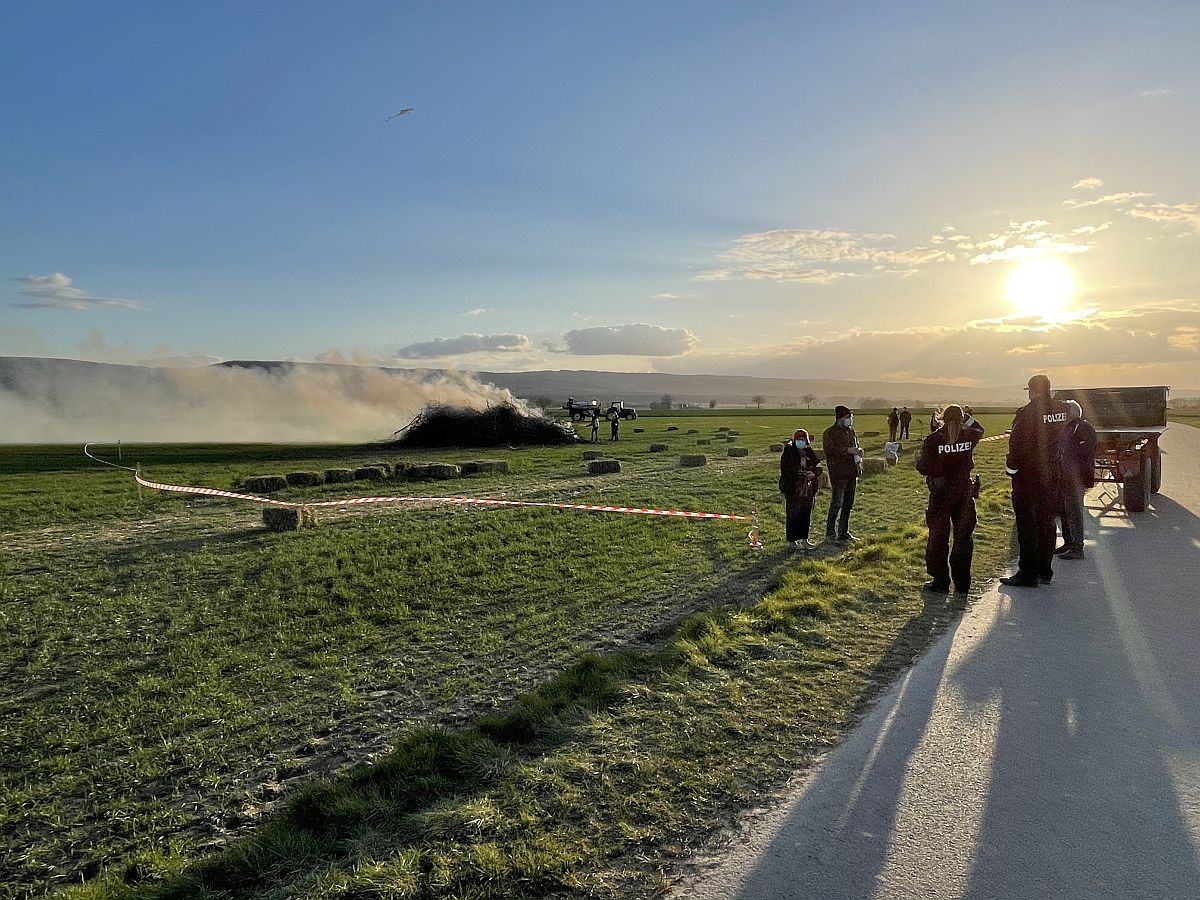 Um 17.30 Uhr waren Polizei und Ordnungsamt vor Ort und inspizierten die Versammlungsstelle. Gegen 18 Uhr erschien dann auch als Anmelder Evestorfs Ortsbürgermeister Ernst Herbst, kurz danach die nach eigenen Angaben als "Mitveranstalterin" auftretende Sabine Meyer, bis September 2013 Herbsts Stellvertreterin im Ortsrat. Kurze Aufregung: die Region hatte angewiesen, dass die Feuerstelle nebst Sitzgelegenheiten (Strohballen) mit Flatterband eingegrenzt werden muss, um Teilnehmer und Dritte zu differenzieren. Dass das einen guten Grund hatte, wurde gegen 19 Uhr klar, als die Veranstaltung beginnen sollte. Bis dahin hatten sich nämlich nur die Veranstalter und ihre Ordnungskräfte sowie die Musiker eingefunden. Sabein Meyer verteilte eifrig an die Teilnehmer "Buttons" - und wurde bis 19.15 Uhr davon nur drei los. Zu Beginn der Veranstaltung um 19 Uhr hielten sich allerdings zwei der drei Personen außerhalb der Versammlungsstätte auf - nur Hartmut Falkenberg, bis 2009 Ortsbürgermeister von Evestorf, war als Teilnehmer vor Ort. Wäre auch er nicht in der abgesteckten Versammlunggsstätte gewesen, wäre die Veranstaltung samt Mahnfeuer entfallen. So loderten die Flammen des "Mahnfeuers" zu den Klängen von "Die Gedanken sind frei" durch die Feldmark.