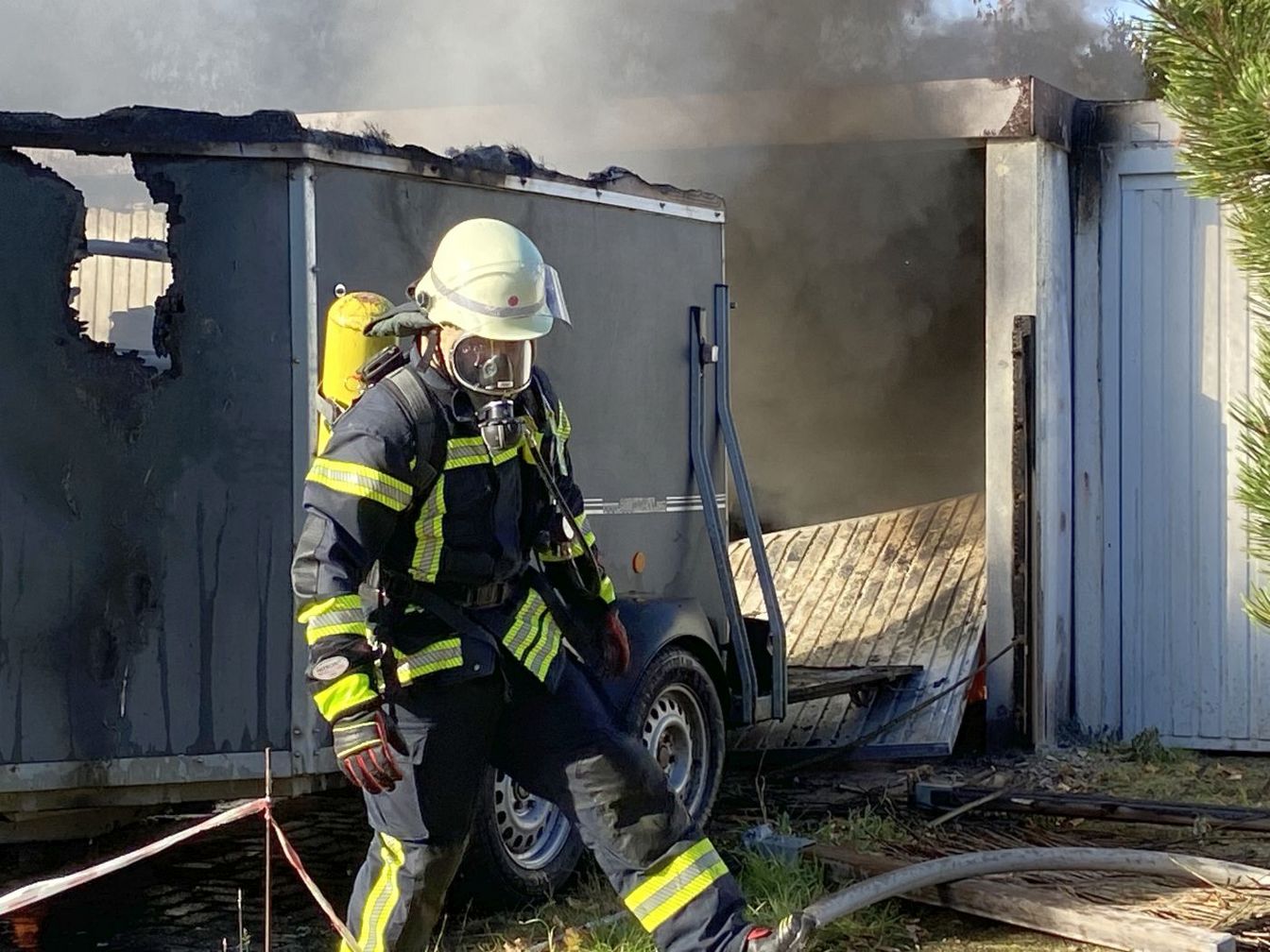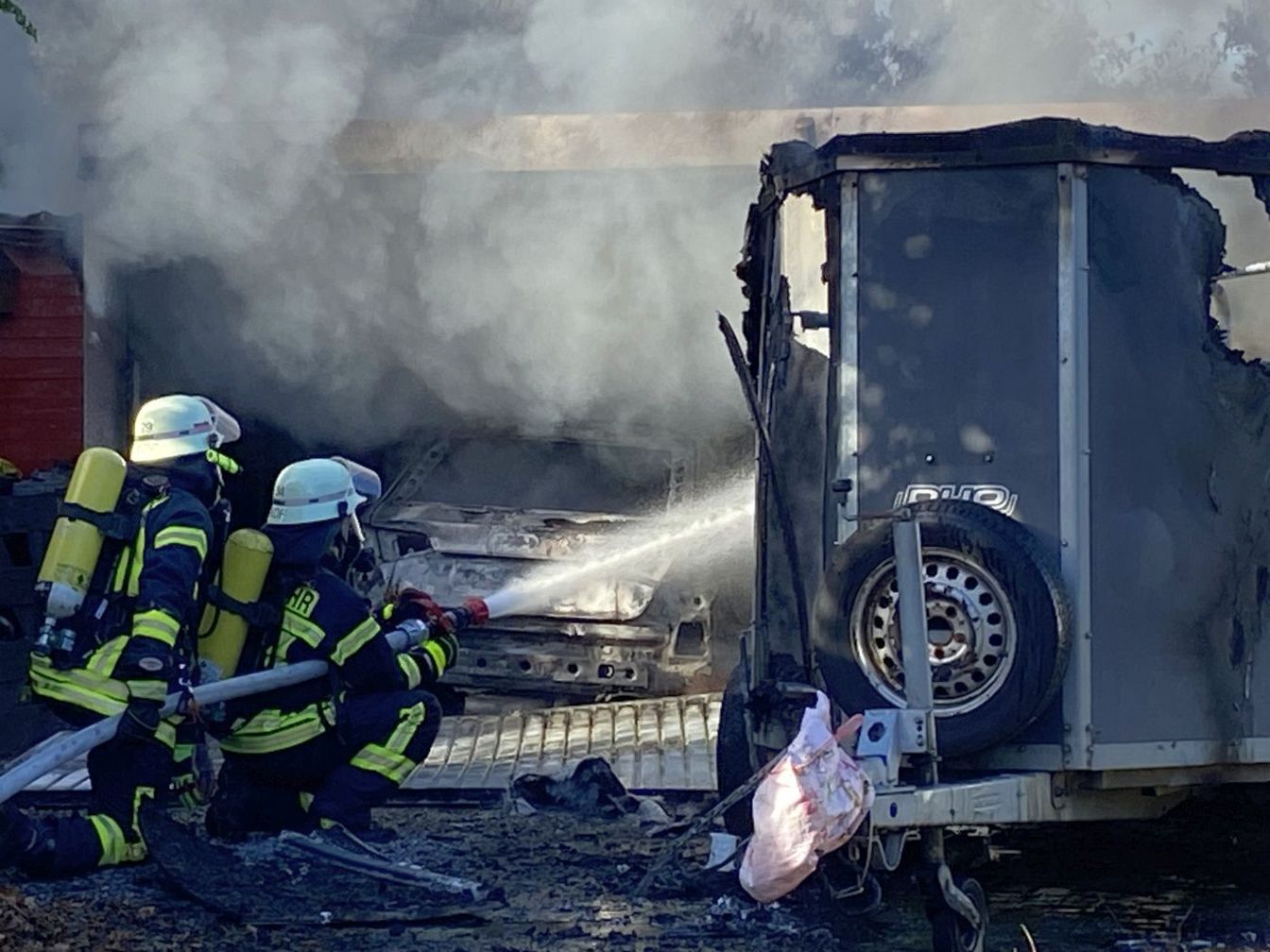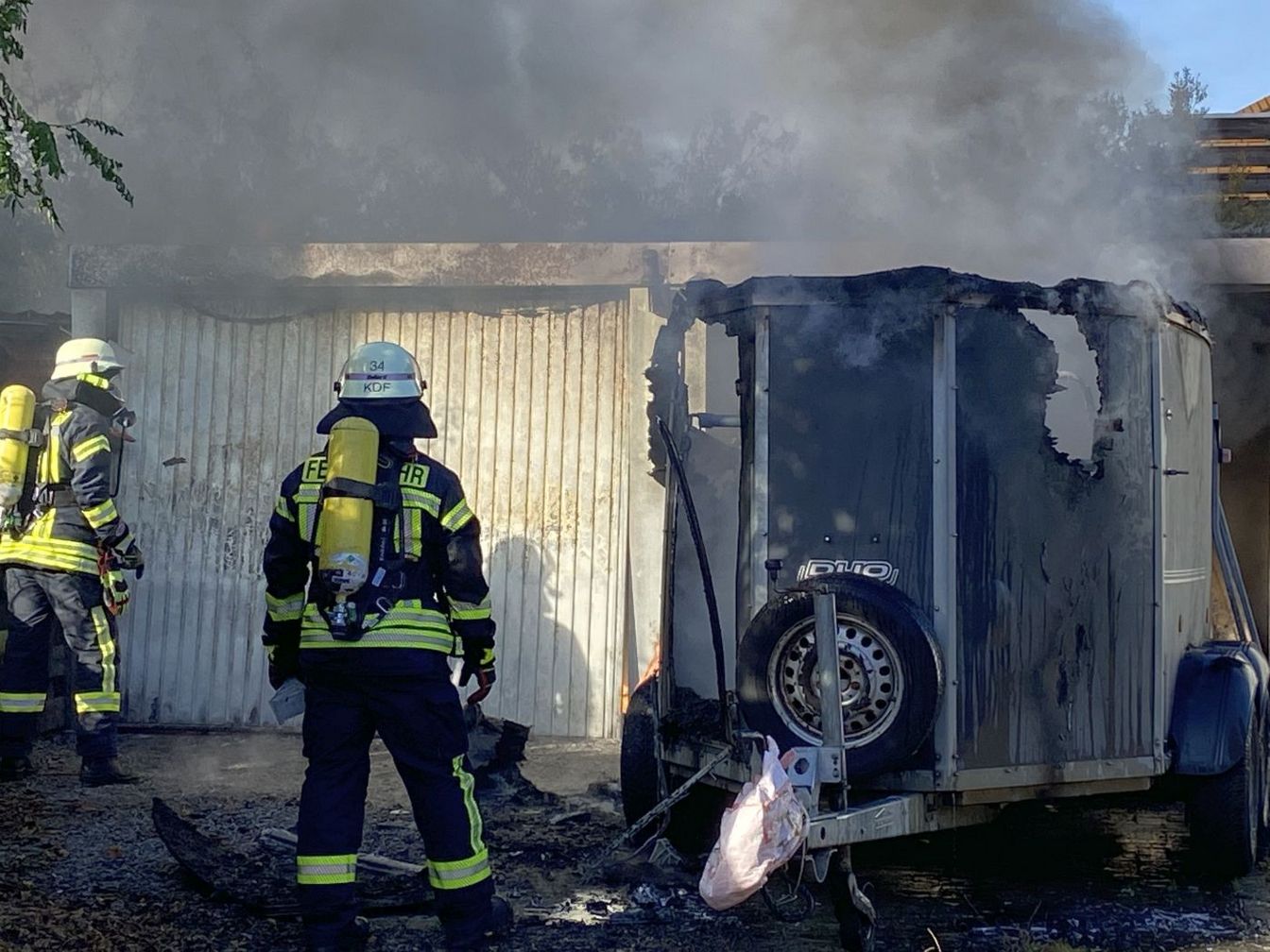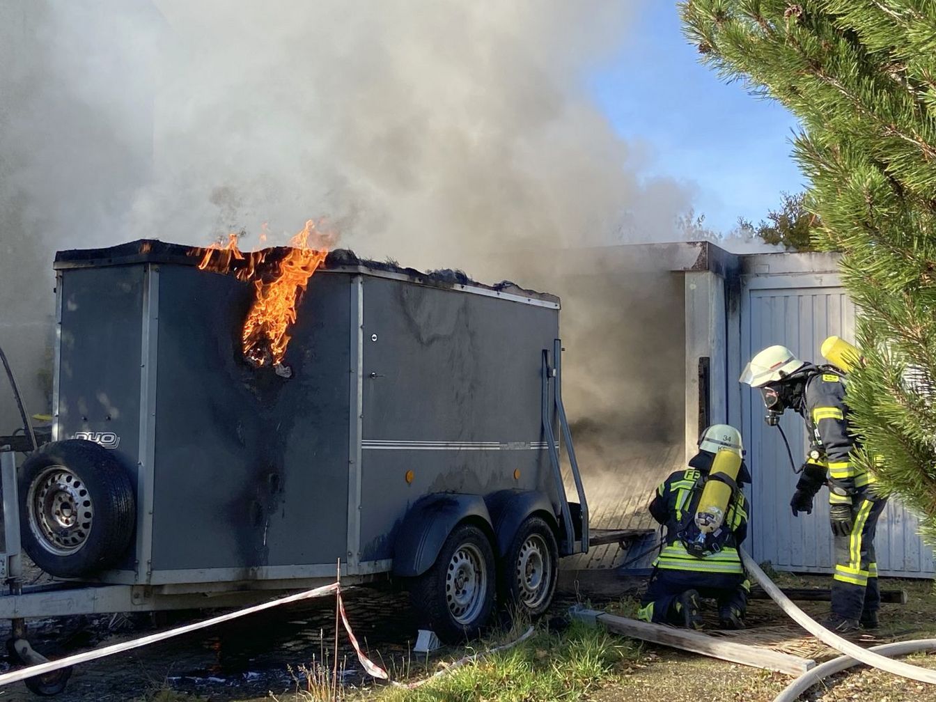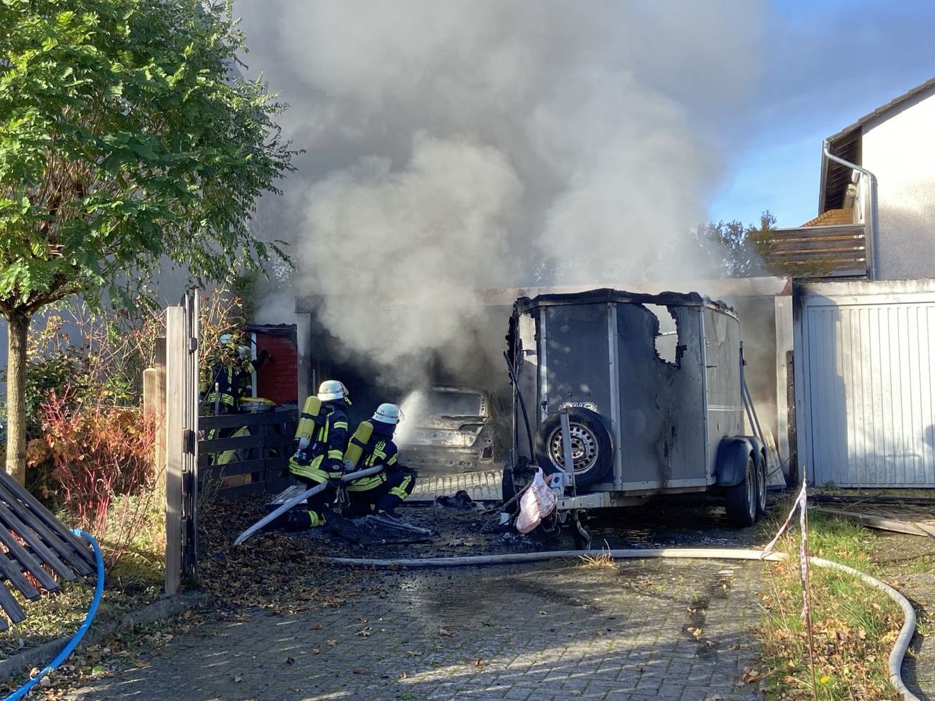 Bei Ankunft der Einsatzkräfte stand die Doppelgarage in Vollbrand und das Feuer drohte auf ein anliegendes Wohnhaus überzugreifen. Dies konnte dank des schnellen Handelns der Feuerwehr jedoch verhindert werden. Ein vor der Garage abgestellter Anhänger geriet ebenfalls in Brand und musste abgelöscht werden.