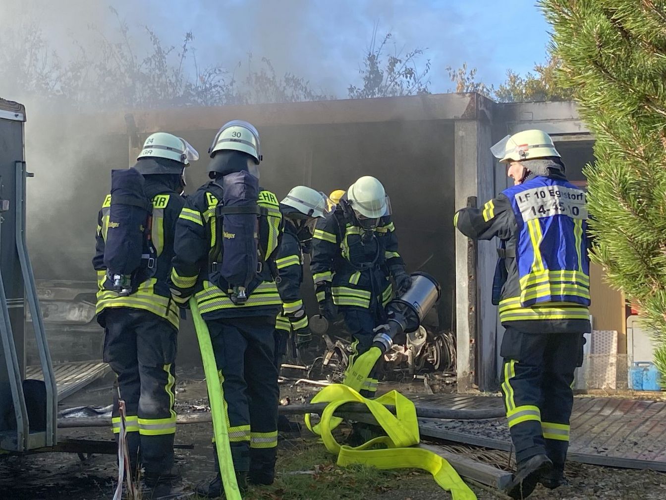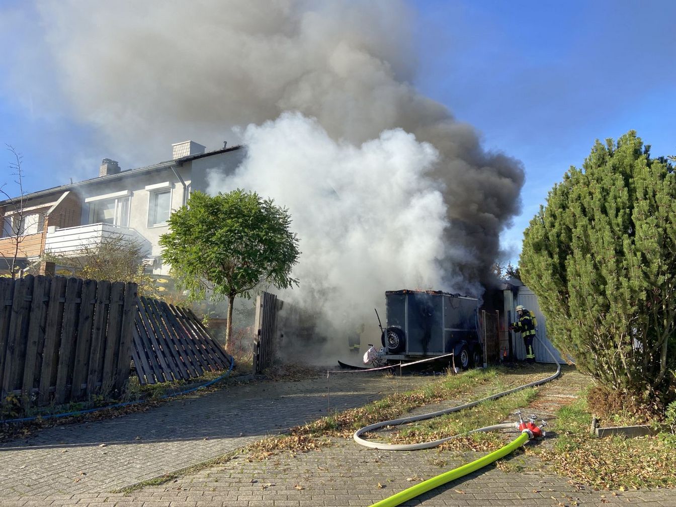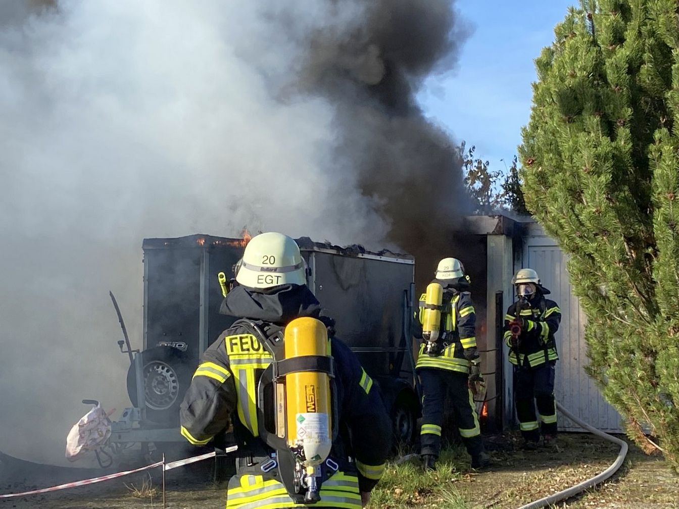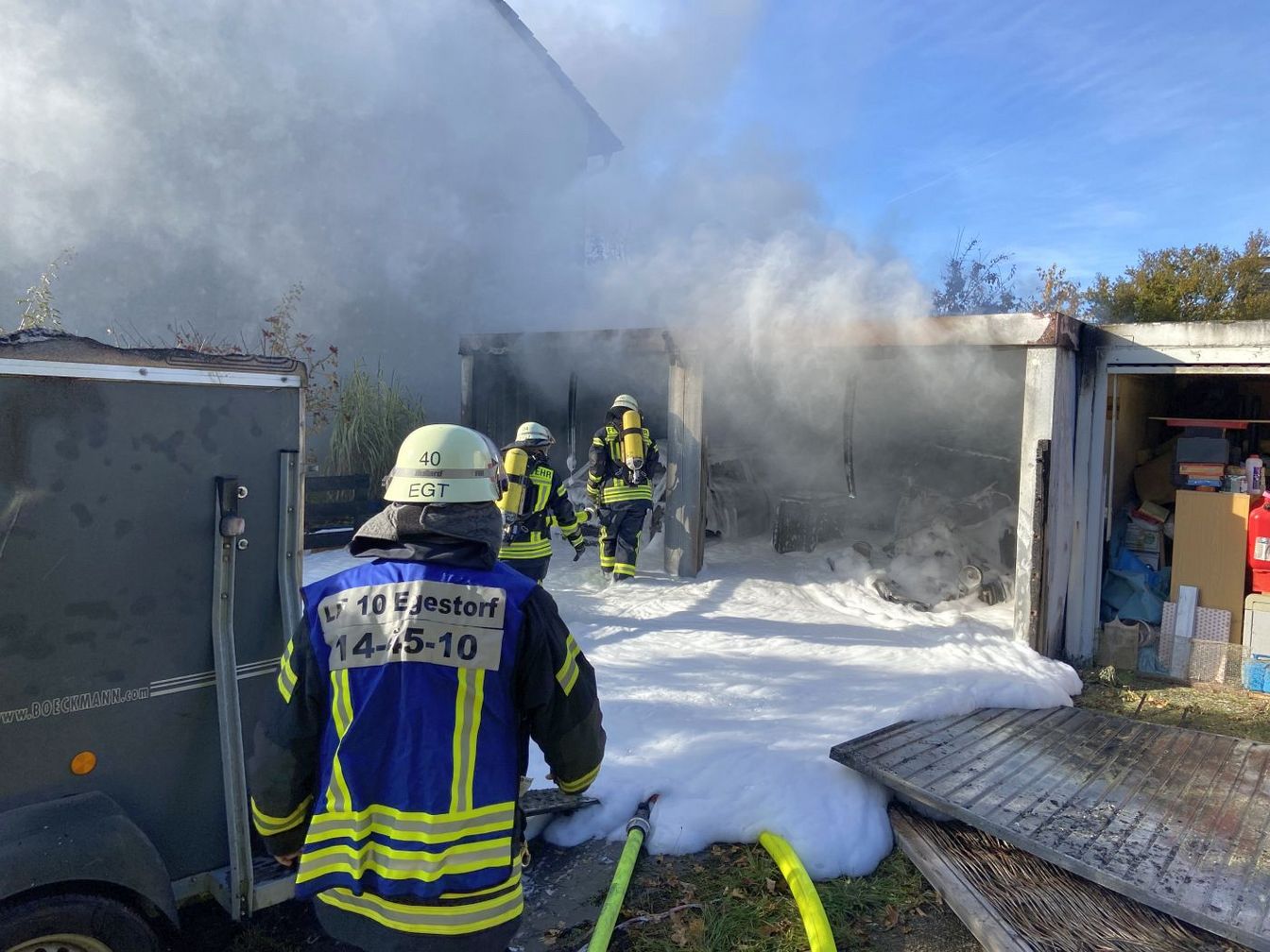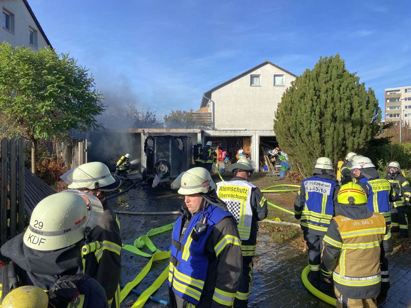 Bei Ankunft der Einsatzkräfte stand die Doppelgarage in Vollbrand und das Feuer drohte auf ein anliegendes Wohnhaus überzugreifen. Dies konnte dank des schnellen Handelns der Feuerwehr jedoch verhindert werden. Ein vor der Garage abgestellter Anhänger geriet ebenfalls in Brand und musste abgelöscht werden.