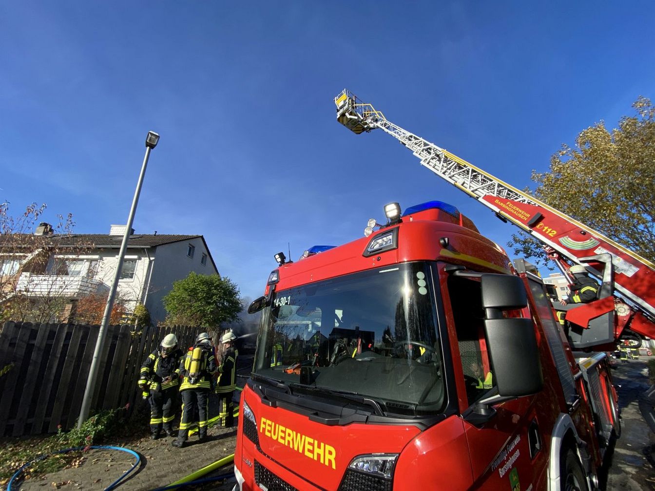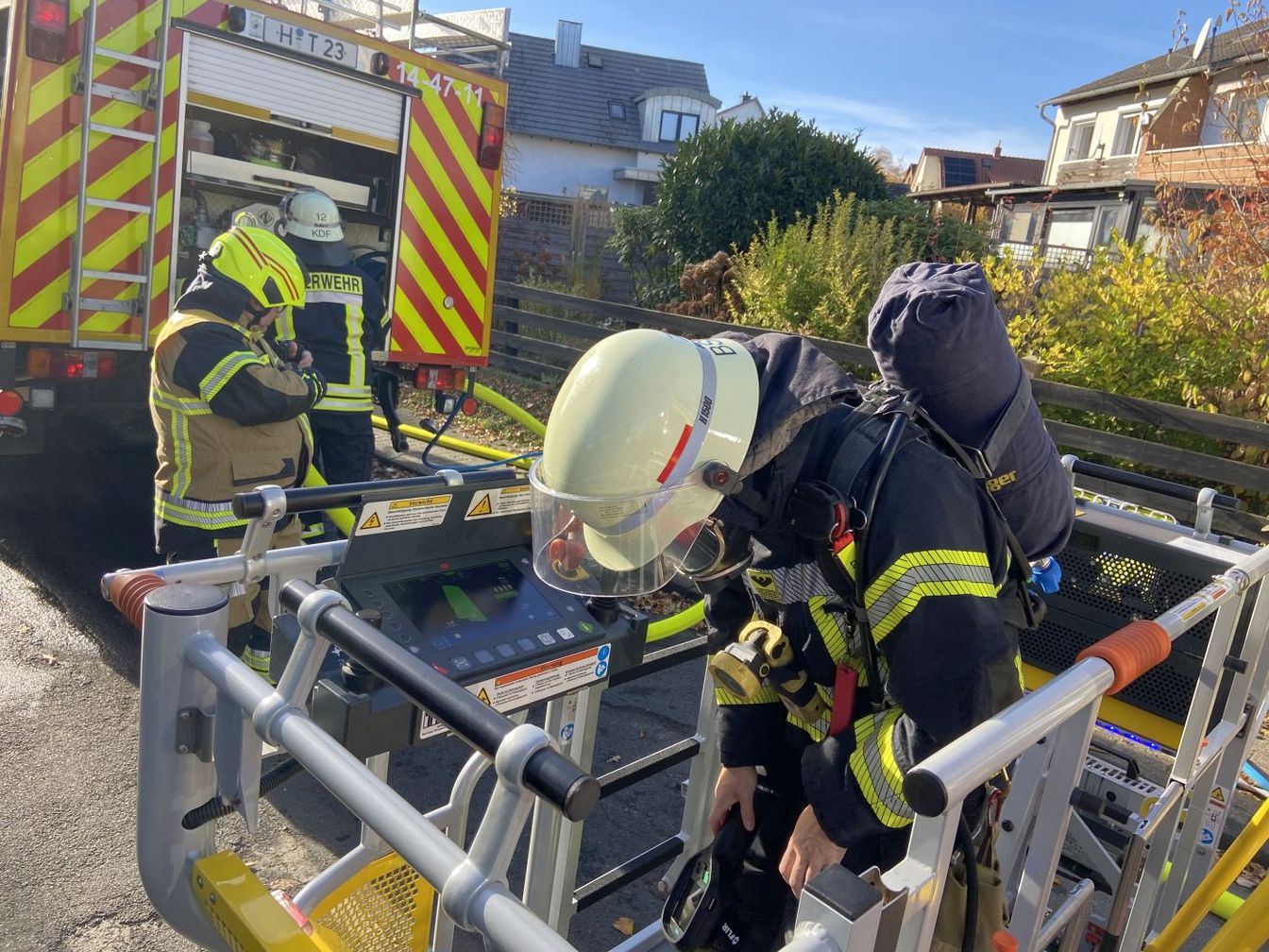 Von der Drehleiter aus wurde die Doppelgarage mit einer Wärmebildkamera überwacht. Die Feuerwehr öffnete das Dach der Garage, um an alle Brandherde heranzukommen.