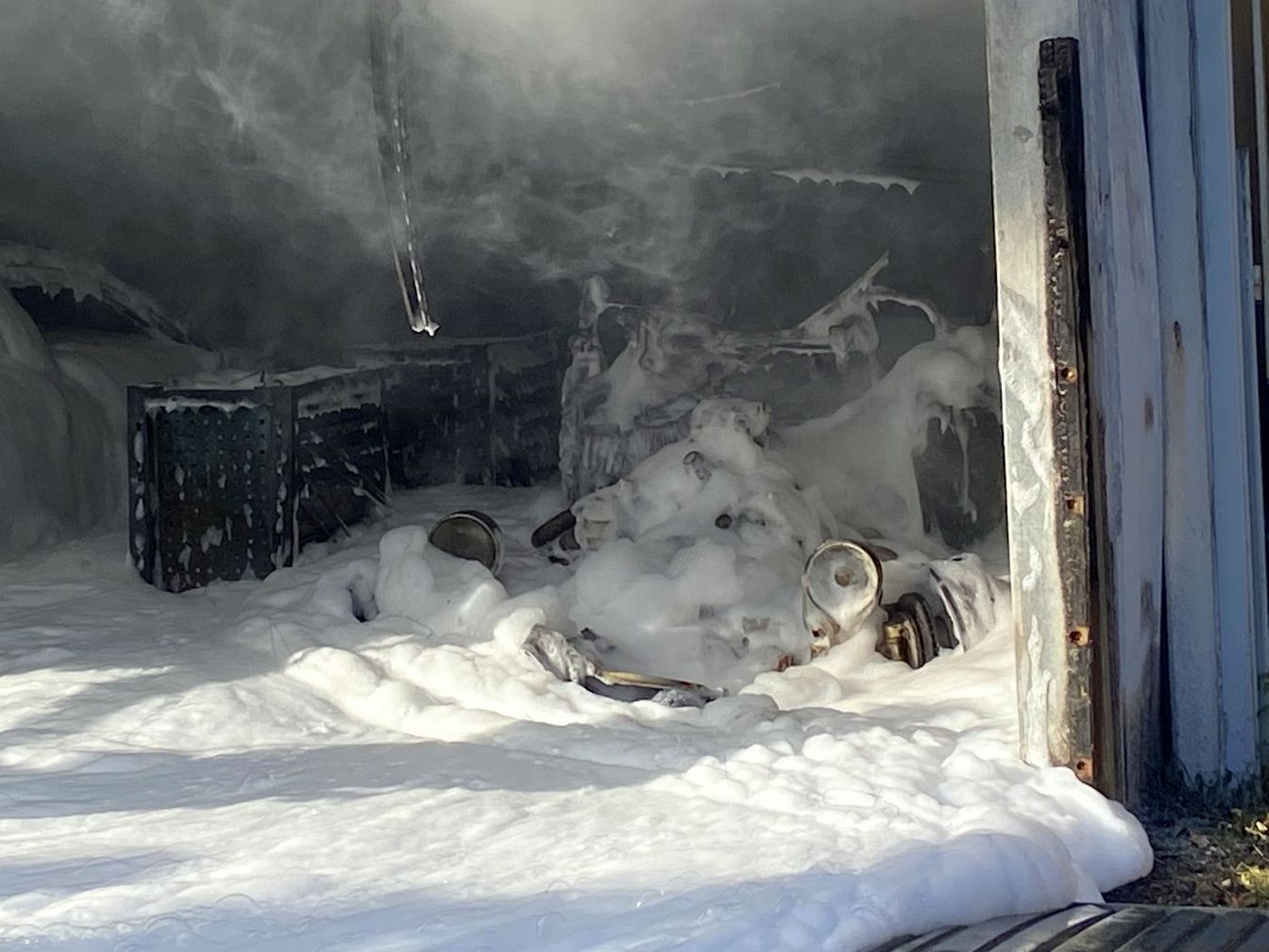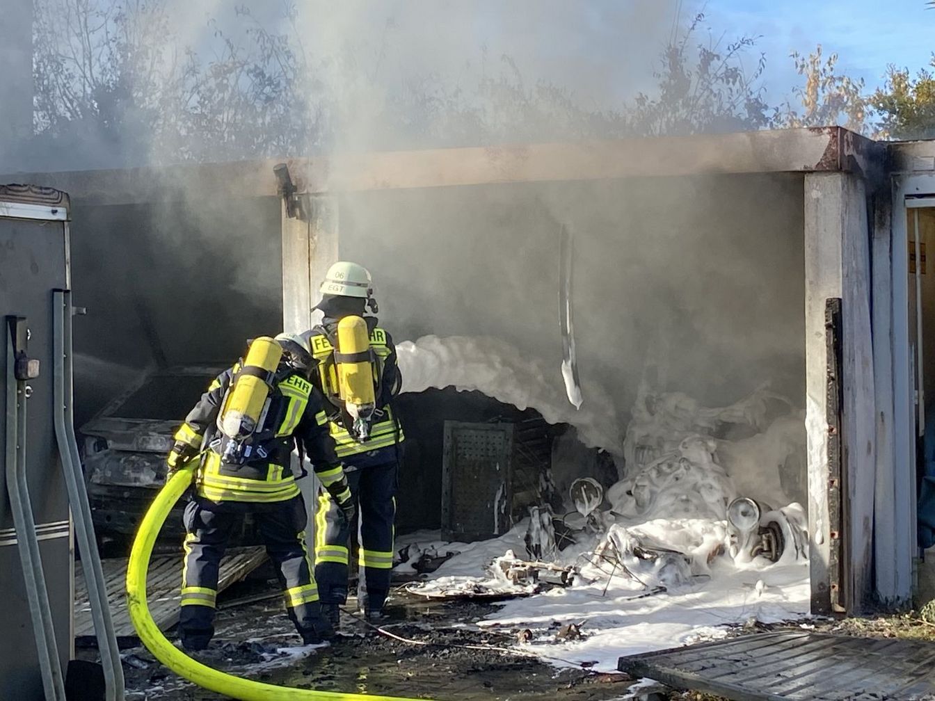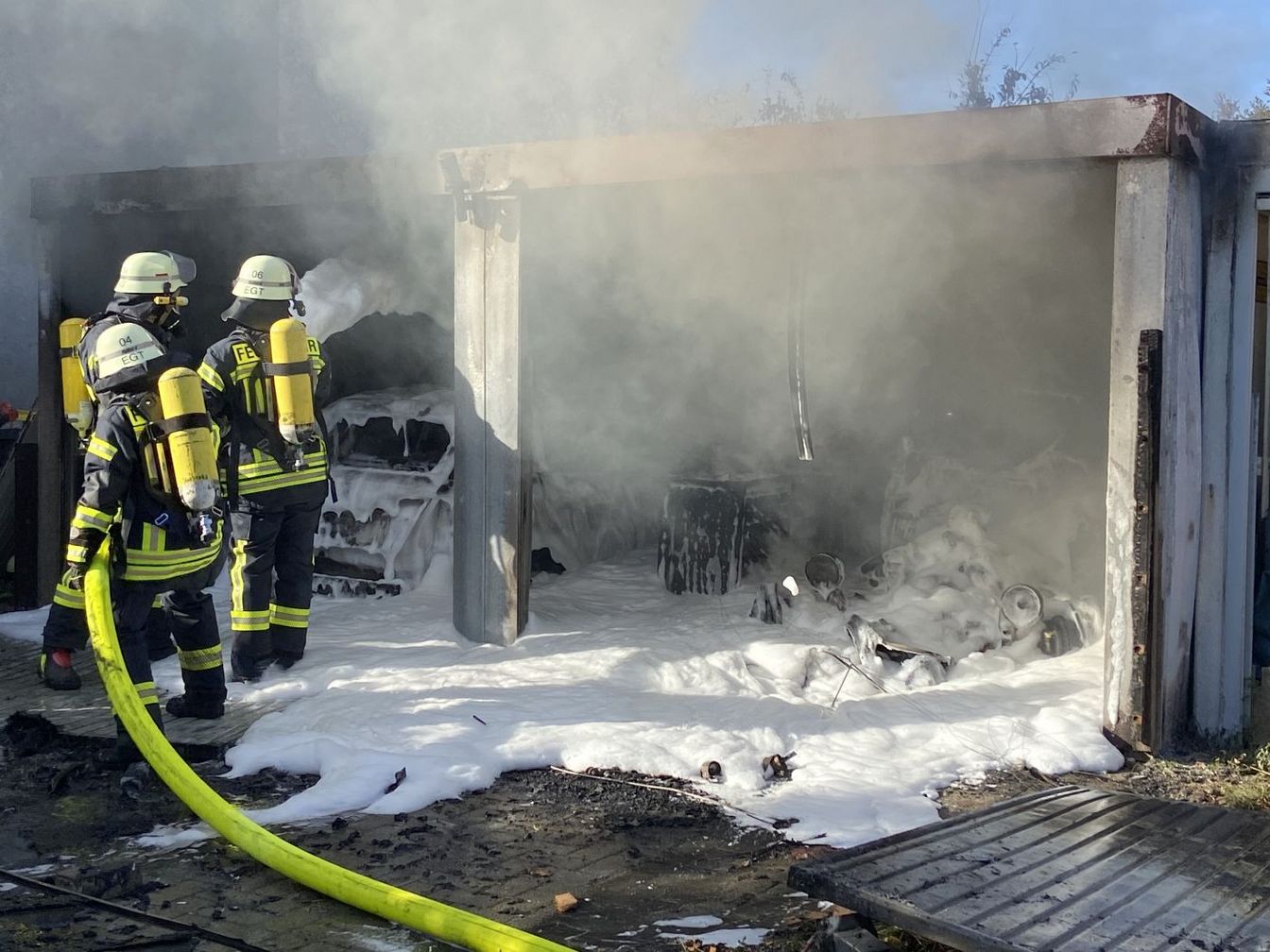 Zwei geparkte Pkw – ein moderneres Fahrzeug und vermutlich ein Oldtimer – brannten in der Garage vollständig aus. Aufgrund der Hitze von bis zu 1.000 Grad, erklärte Pressesprecher Westerschell vor Ort, flammte das Feuer immer wieder auf. Die Feuerwehr beschloss daher, die Garage und die Fahrzeuge mit Schaum abzudecken, um die Flammen und Glutnester zu ersticken.