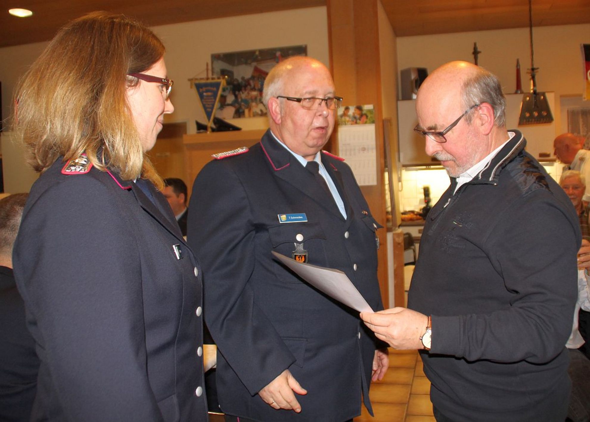 Das Highlight des Abends waren die Ehrungen und Beförderungen der Kameraden. Befördert wurden Julia Heumann-Friedrichs zur Feuerwehrfrau, David Schlegel zum Feuerwehrmann und Kevin Grabenstein zum Oberfeuerwehrmann. Geehrt wurden für 25-jährige Mitgliedschaft Günter Müller und für 40 Jahre Michael Größ und Hans Rehmet. Derzeit zählt die Freiwillige Feuerwehr einen Bestand von 225 Mitgliedern, davon 25 Aktive, vier Passive, drei Jugendliche in der Jugendabteilung, sieben Kinder in der Kinderfeuerwehr und 186 fördernde Mitglieder. Insgesamt wurden in 2017 zehn Einsätze abgearbeitet.