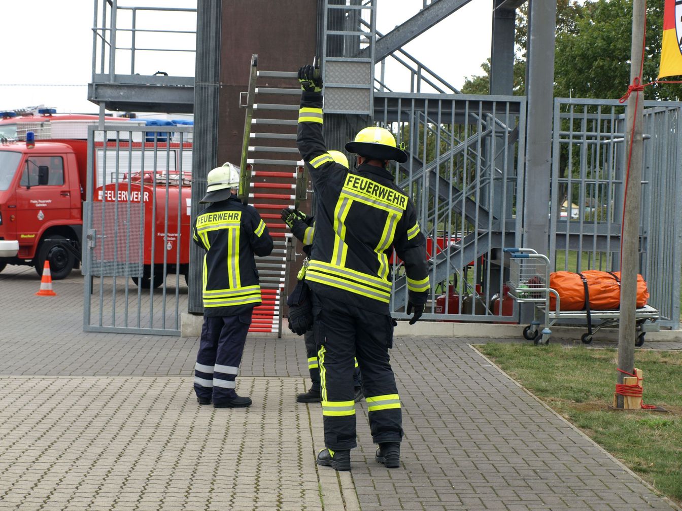 Der hohe Übungsturm ist schon von weitem zu erkennen. „So etwas haben nicht viele, andere kommen hierher zum Üben“, sagt der Moderator stolz beim Tag der Offenen Tür und kündigt dort eine inszenierte Menschenrettung an. Dafür müssen die Feuerwehrmänner erst einmal gemeinsam die Leiter aufschieben und dann mit ihrer Unterstützung auf den Turm klettern.