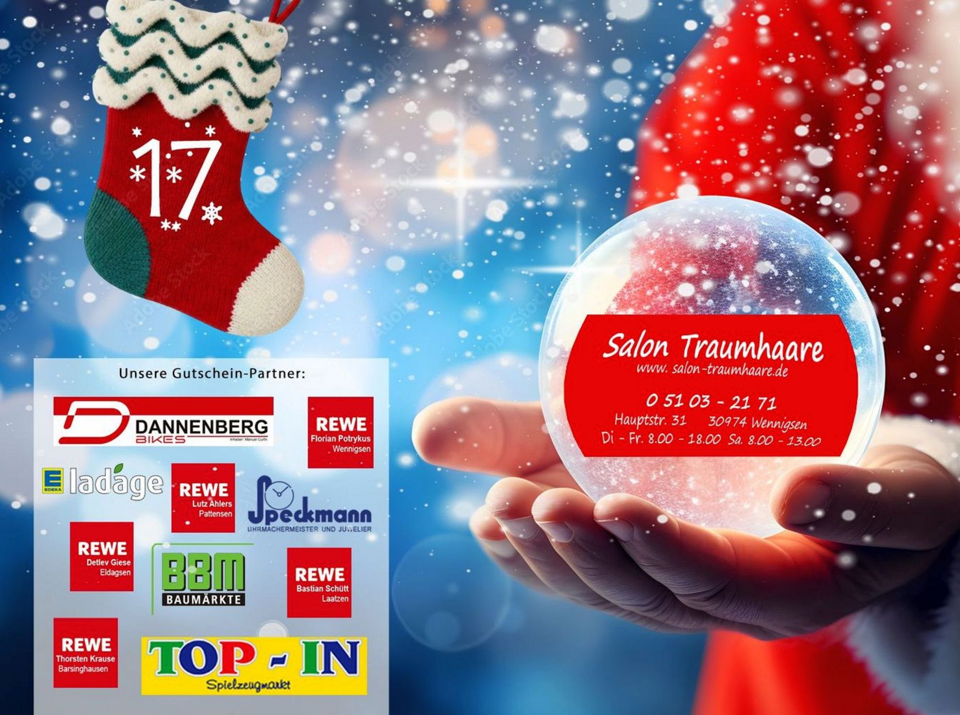 Heute unterstützt uns der Salon Traumhaare aus Wennigsen bei unserem Adventskalender. Geschäftsführerin Ulrike Walther hat ein starkes Team um sich gesammelt. Neben Waschen, Legen, Föhnen bietet das Team Traumhaare für Kinder, Männer und Frauen an. Auch zu Haarverdichtungen, Haarverlängerungen und Haarausfall-Lösungen berät das kompetente Team seine Kunden gerne.