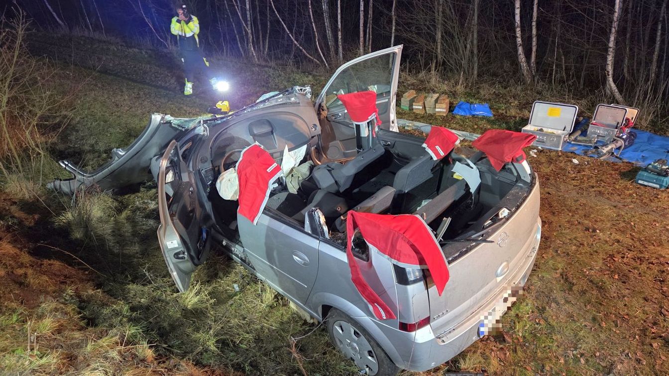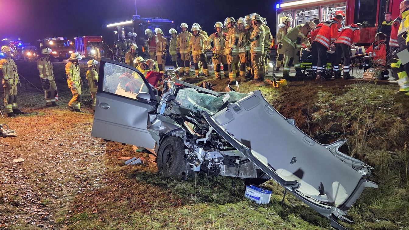 Nach ersten Erkenntnissen war eine Seniorin mit ihrem Opel aus bislang ungeklärter Ursache auf einen Radlader aufgefahren. Infolge des Zusammenstoßes kam der Pkw von der Fahrbahn ab und blieb im angrenzenden Seitengraben stehen. Da die Fahrerin über starke Rückenschmerzen klagte, entschieden der Rettungsdienst und der mitalarmierte Notarzt gemeinsam, eine patientenschonende Rettung durchzuführen. Hierzu wurde das Fahrzeug zunächst stabilisiert. Anschließend entfernten die Einsatzkräfte mit hydraulischem Rettungsgerät das Dach des Opel. Die Fahrerin wurde danach achsengerecht mithilfe eines Spineboards aus dem Fahrzeug gerettet und über die Böschung zum bereitstehenden Rettungswagen transportiert.