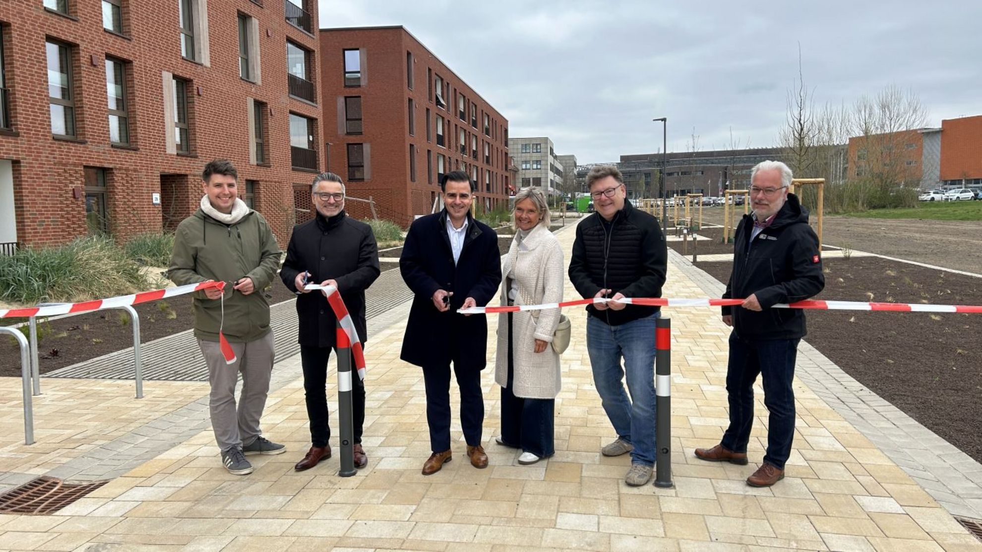 Garbsen. Das neue Wohnquartier „Grasgrün bis Himmelblau“ direkt hinter dem Rathaus hat ab sofort eine eigene Wegeverbindung. Der „Boulevard Neue Mitte“ schließt an die Europa-Allee an und ermöglicht den Anwohnern einen direkten Zugang. „Hier ist großzügig Platz für Fußgänger, Radfahrer und Autos. Nachhaltigkeit und kluge Verkehrsführung ergänzen sich eindrucksvoll“, sagte Bürgermeister Claudio Provenzano beim Pressetermin vor Ort..