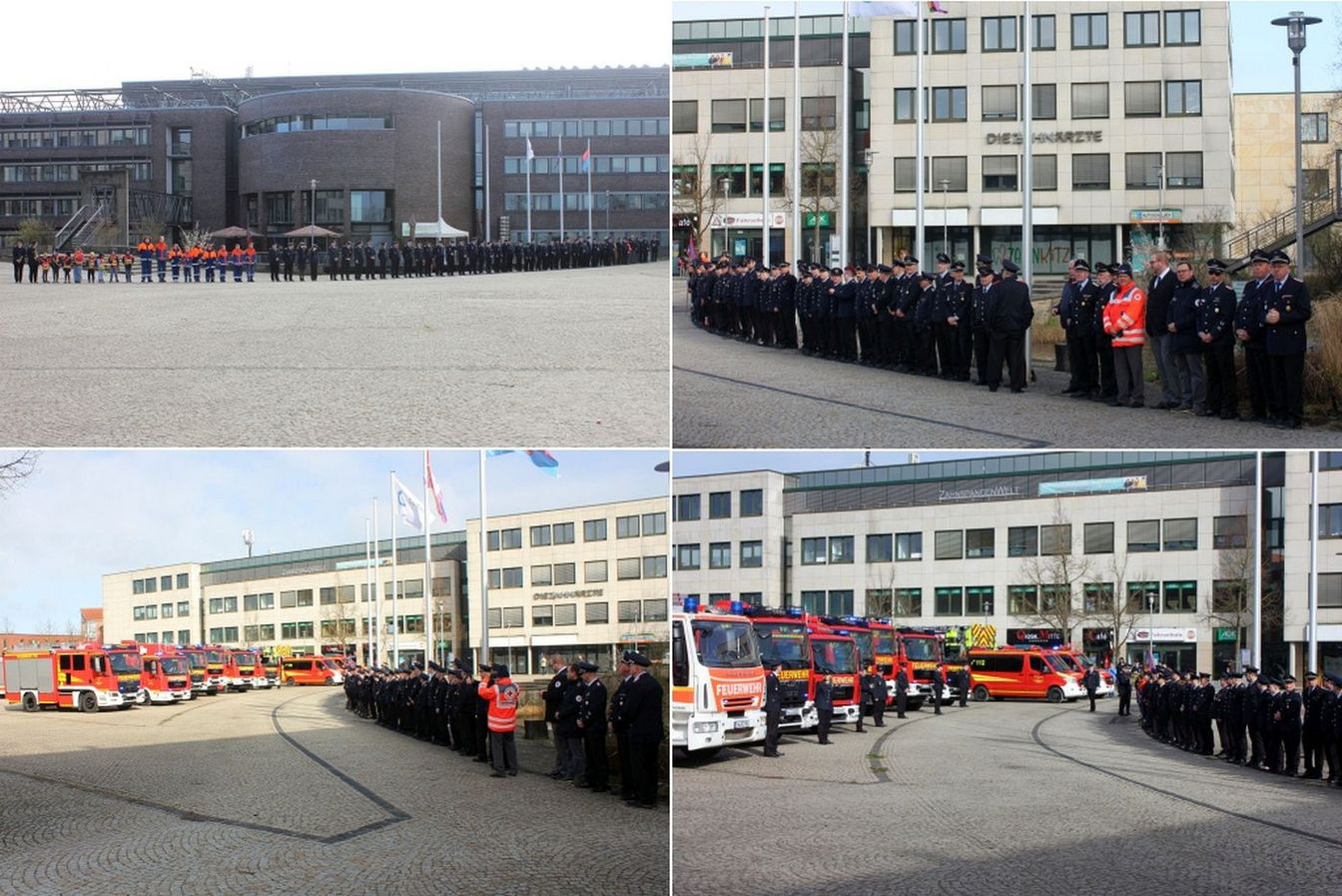 Auf dem Rathausplatz wurden die beiden scheidenden Ortsbrandmeister von den angetretenen Mitgliedern der aktiven Abteilung, der Alters- und Ehrenabteilung sowie von Kinder- und Jugendfeuerwehr, von Abordnungen der Partnerfeuerwehr aus Markoldendorf und des DRK Garbsen empfangen. Zuvor waren sie von einem Korso aus allen Fahrzeugen der Ortsfeuerwehr von zuhause abgeholt worden.