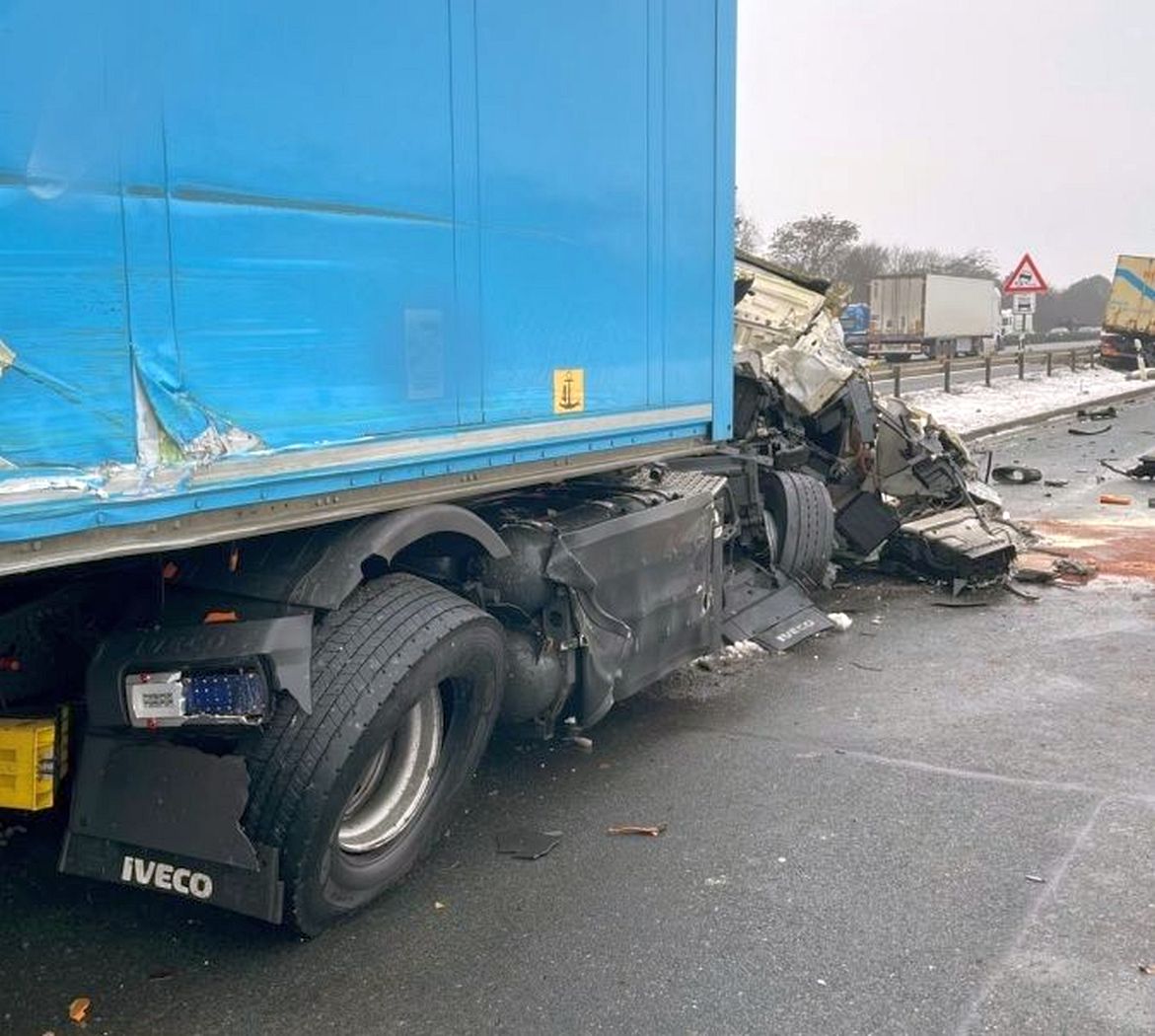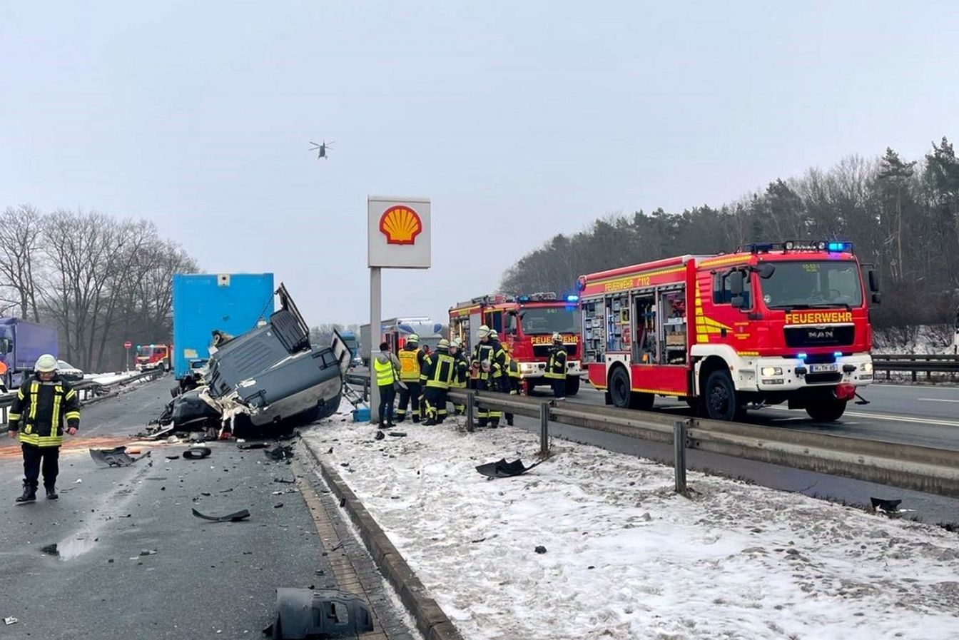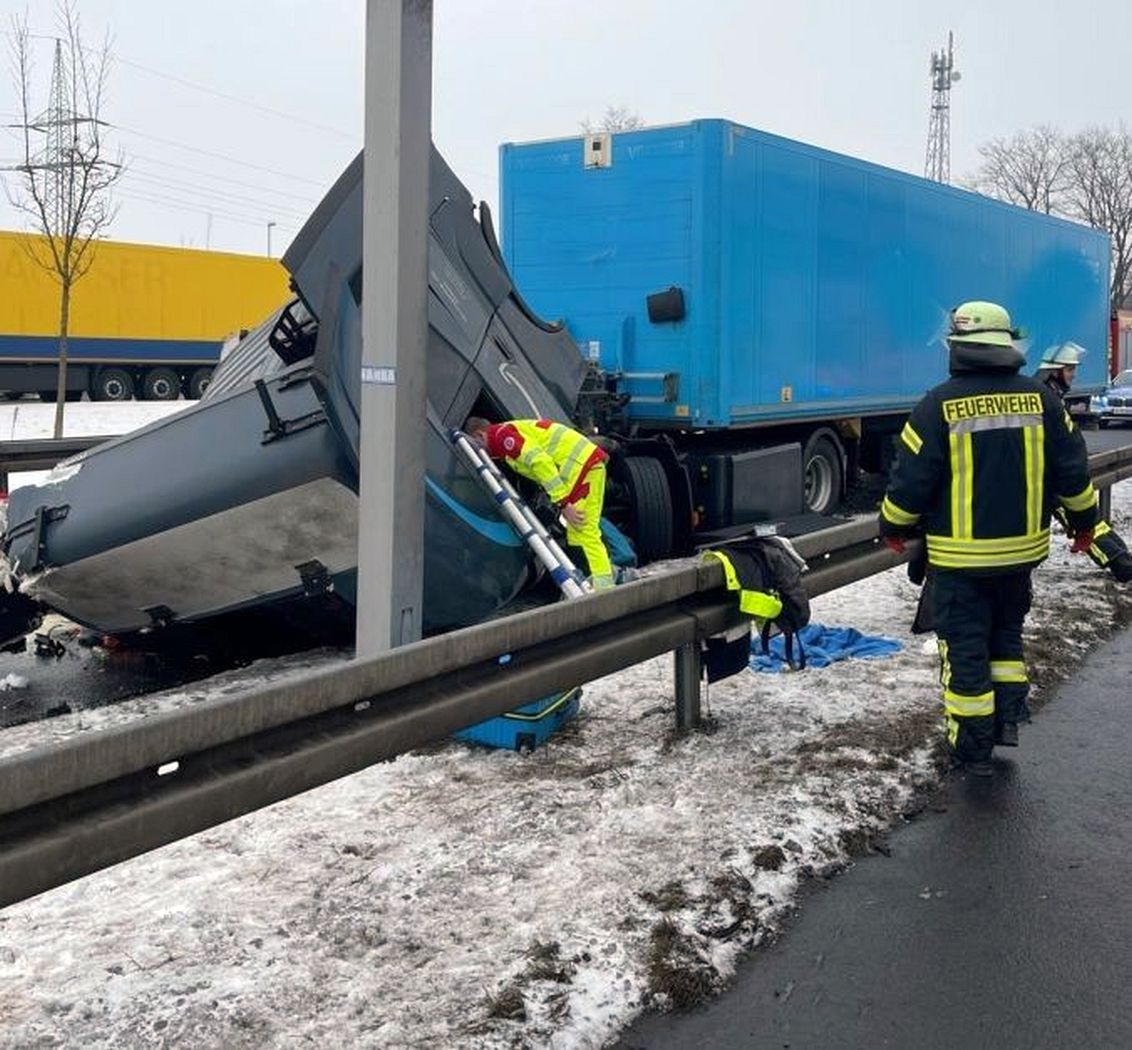 Dabei wurde das Fahrerhaus des parkenden Lkw stark beschädigt und kippte auf die Fahrbahn. Der Unfallverursacher verlor bei dem Unfall seinen Anhänger und kam mit dem Zugfahrzeug in der Leitplanke zum Stehen.