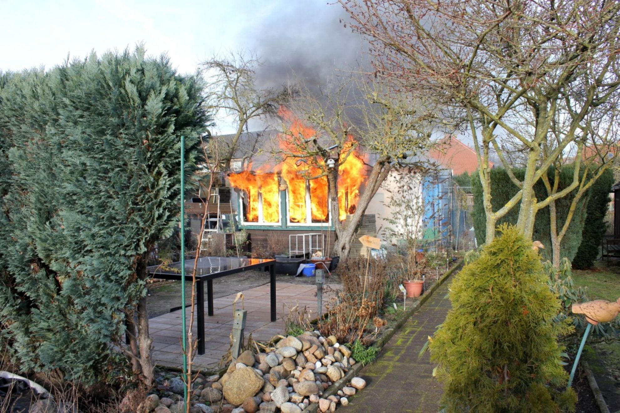Garbsen. Am Freitagvormittag gegen 11.20 Uhr wurde die Ortsfeuerwehr Garbsen zur Gartenkolonie im Bereich Pottbergsweg/Beethovenstraße in Altgarbsen gerufen. In der Gartenkolonie brannte eine Gartenlaube. Beim Eintreffen der ersten Einsatzkräfte schlugen bereits Flammen aus dem Dach und der Anbau einer Gartenlaube stand komplett in Brand.