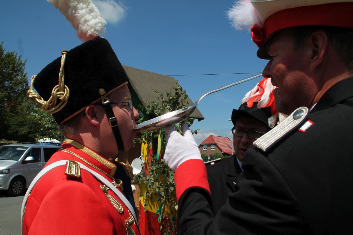 In der Wennigser Mark kam heute Vormittag die Prominenz des Historischen Freischießens zusammen. Seine Majestät Ernst-Udo Schmidt hatte alle Offiziere in den "Königspalast" zum Essen eingeladen. Auch der Stabsarzt und sein Provisor durften dabei nicht fehlen und überprüften den Gesundheitszustand Seiner Majestät. Erfreulicherweise konnten ihm die Böllerschüsse am frühen Sonntagmorgen nichts anhaben und er erfreut sich bester Gesundheit. Stabsarzt Dr. Colshorn (Yorck Heerhorst) zeichnete Majestät nach Verabreichung zweier stärkender Medizin (Nummer 22 und Nummer 2a) als "tauglich" aus.