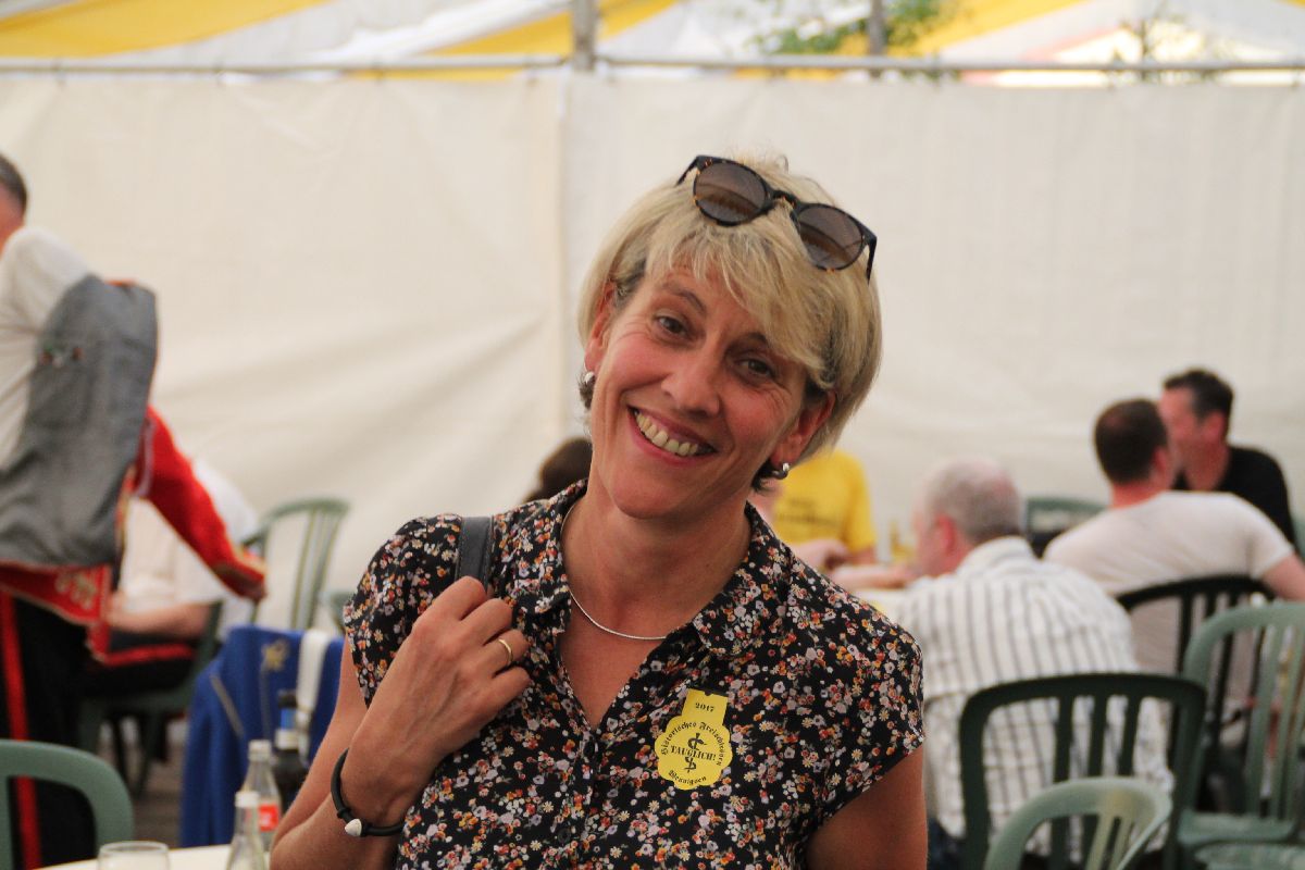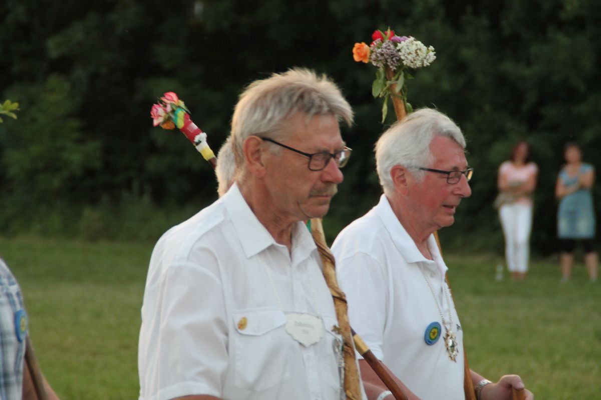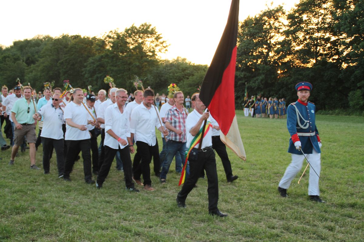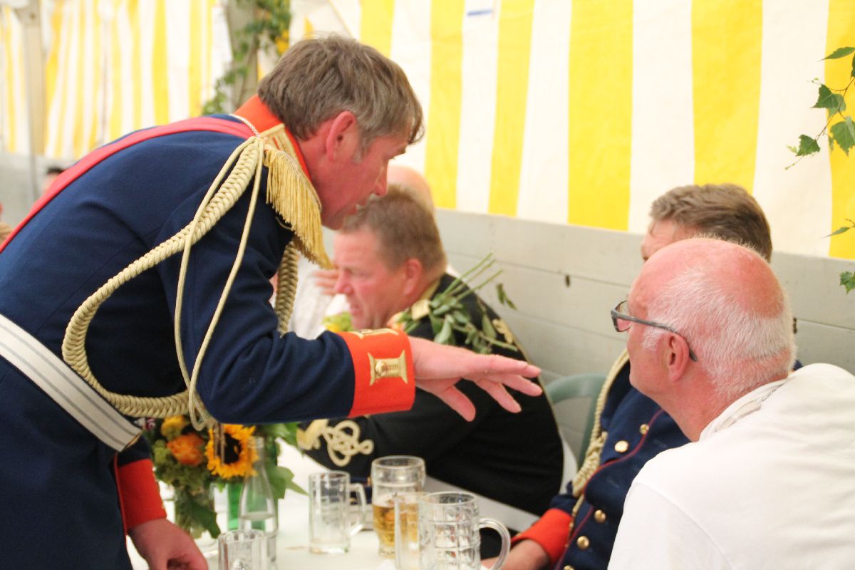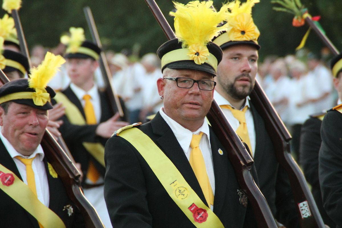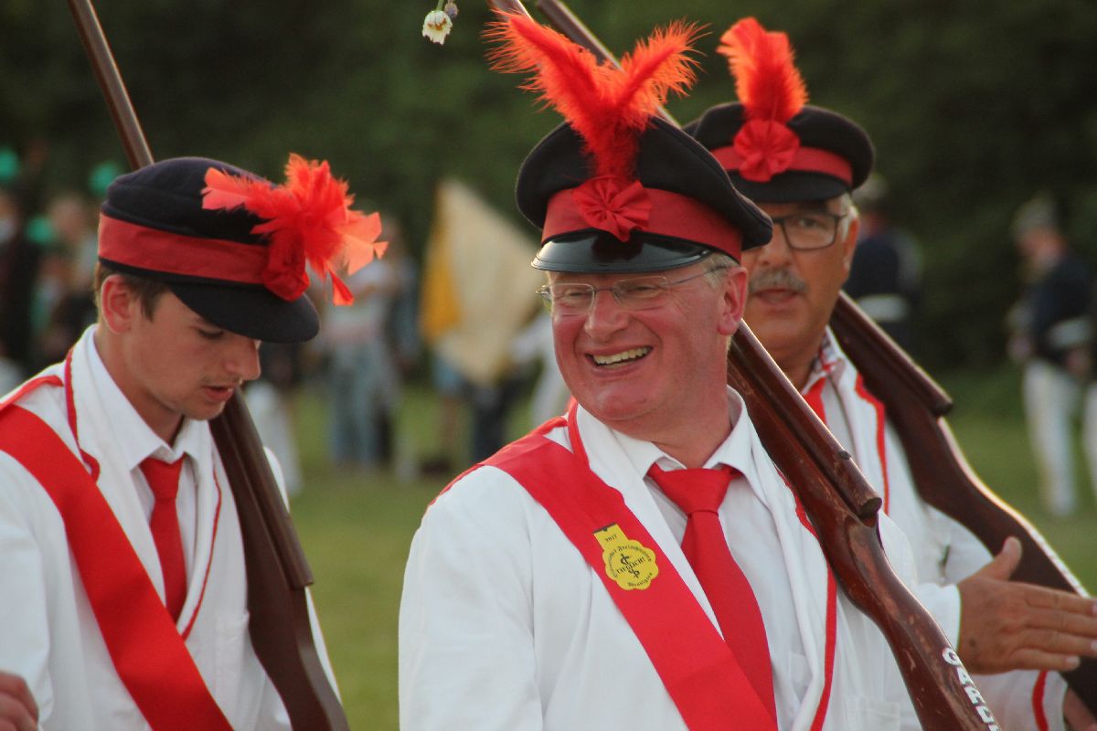 An vielen Stellen wird von einem "imaginären Feind" gesprochen, wenn es um das Historische Freischießen geht. Doch heute gab es einen klaren Gegner, vielleicht nicht gleich einen Feind: die Sonne. In den Garden, aber auch an einzeln besetzten Stellen des Festes musste improvisiert werden: so musste der Gemeindefahnenträger sein Amt nach dem Umzug abgeben und sich medizinisch versorgen lassen. Schon beim Abschwenken heute Abend und auch an den nächsten beiden Tagen wird ein Anderer die Fahne übernehmen.