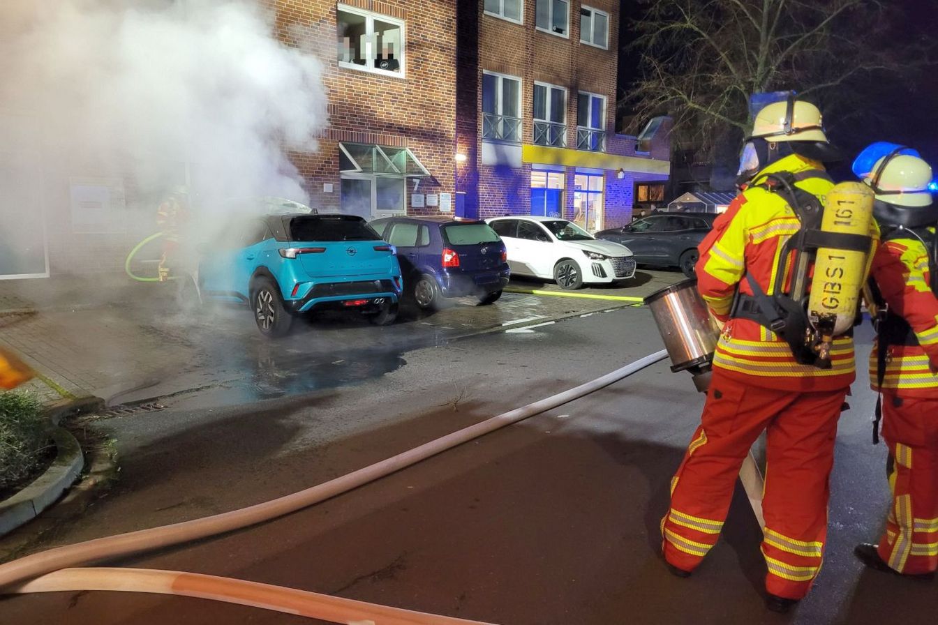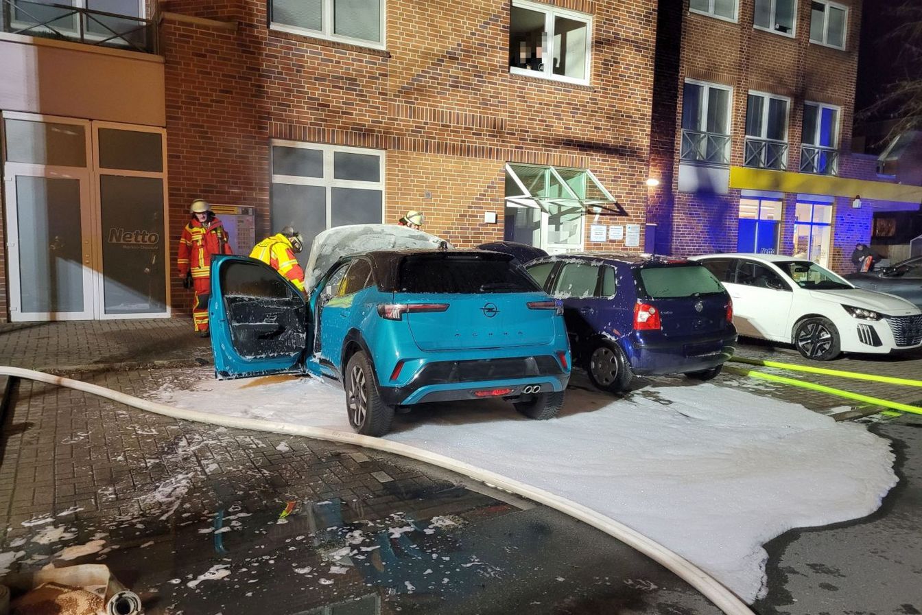 Beim Eintreffen der ersten Einsatzkräfte stand ein Opel auf einem Parkplatz im Motorraum in Flammen. Noch während der ersten Maßnahmen griff das Feuer auf einen daneben abgestellten VW über.