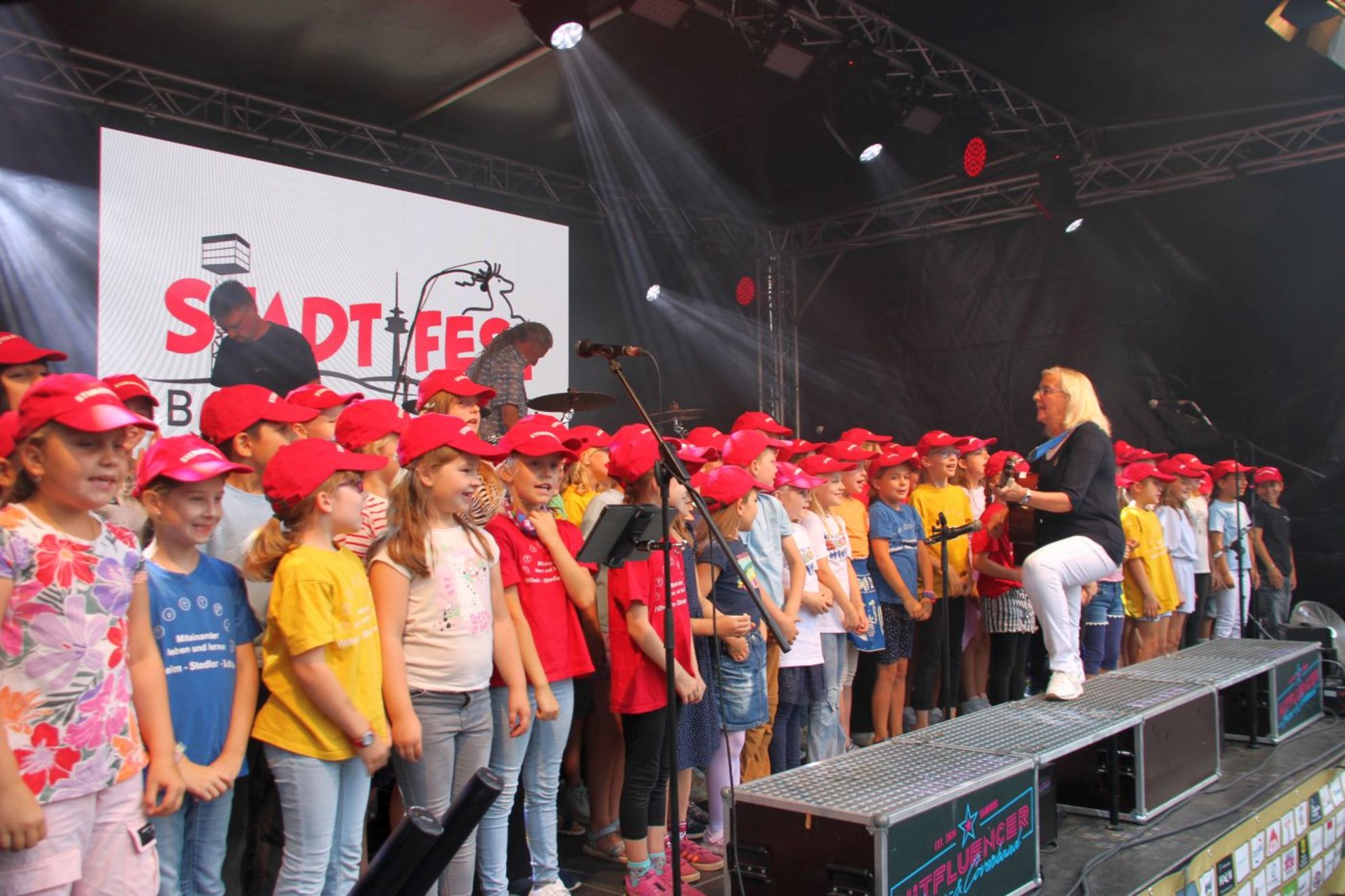 „Willkommen zum 52. Stadtfest“, begrüßte der Vorsitzende der IG Stadtfest, Torsten Sander, die Menschenmenge, nachdem der Chor der Wilhelm-Stedler-Schule traditionell das Eröffnungslied sang, „Er dankte auch seinem Team für die Unterstützung sowie den Helfern an den Theken, der Polizei, Feuerwehr, ASB, BBI, Stadtverwaltung und Politik.“ Nur gemeinsam sei ein Fest dieser Größe über drei Tage zu schaffen. Eine besondere Ehrung ging dann noch an Jürgen „DJ Hase" Planert. Mit 63 geht das Stadtfest-Urgestein in die verdiente DJ-Rente. „Du hast dem Stadtfest 40 Jahre beigestanden. Wir danken dir sehr“, teilten die IG Stadtfest Mitglieder Planert mit und überreichten ihm eine goldene Schallplatte. DJ Futzi wird die Nachfolge von Planert antreten.