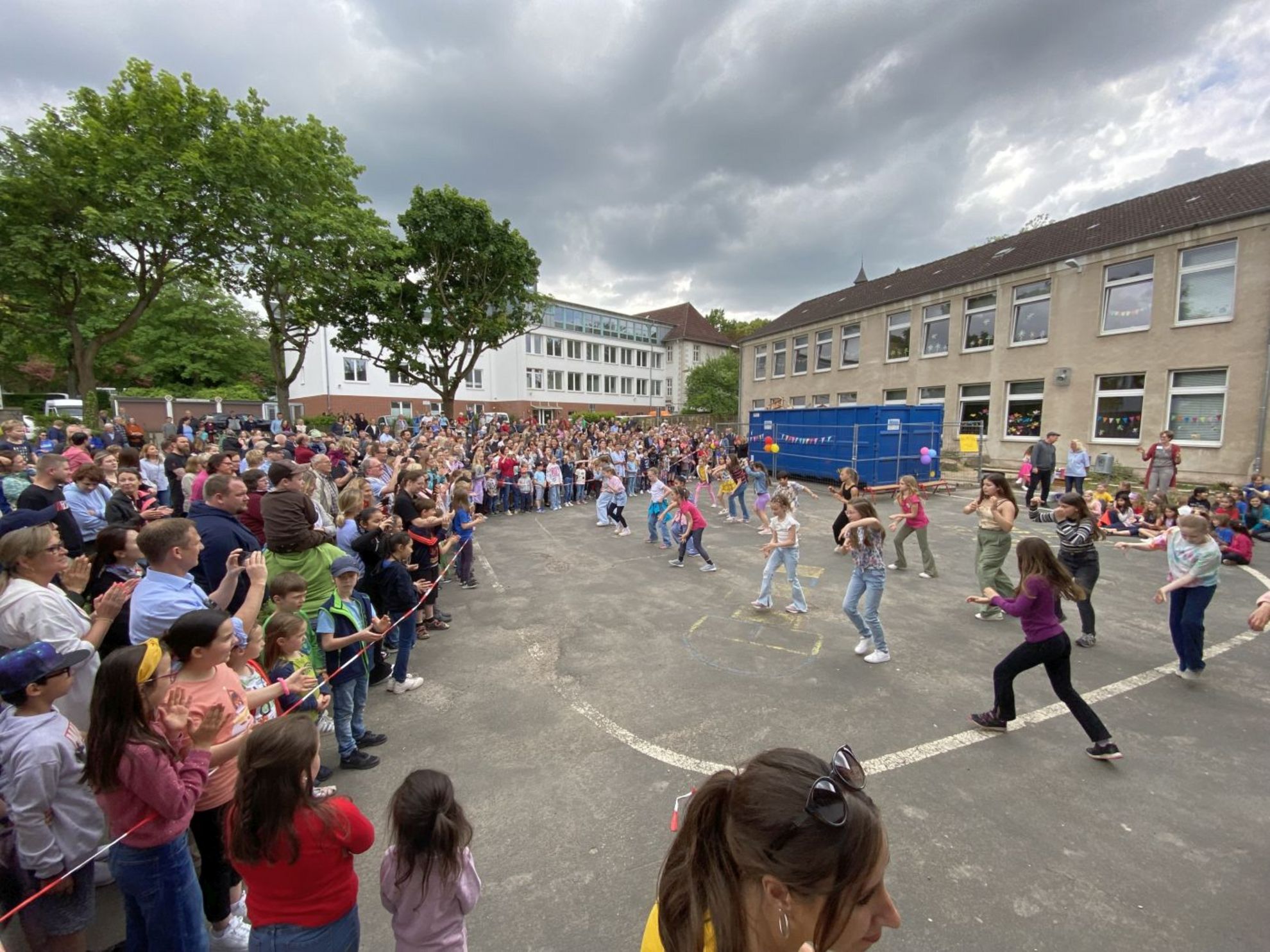 „Die ersten Container sind schon da, der Abriss geht also langsam los“, so Flade zu den hunderten anwesenden Gästen, „Doch wir freuen uns auf die neue Schule.“ Der Abriss und der Neubau in der Innenstadt wird sicherlich für viel Trubel sorgen, für die Kinder werden die Baufahrzeuge aber wohl auch aufregend sein. „Wie immer steht und fällt alles mit guten Lehrkräften“, so Flade weiter, „Und mein Kollegium hat die Kinder in den letzten Wochen schon super mit dem Thema in Kontakt gebracht.“