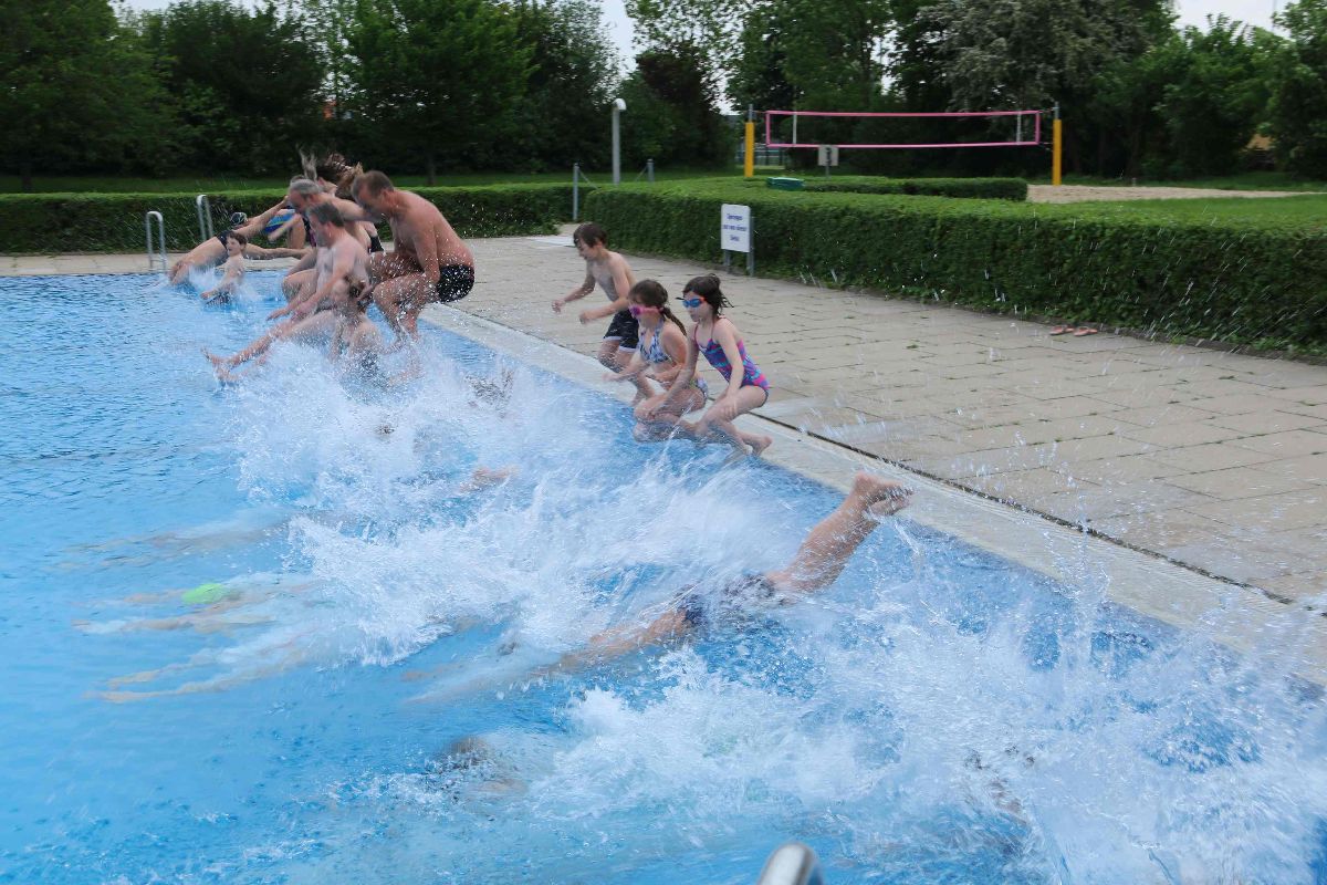 „Mit dem Anschwimmen haben wir offiziell die Freibadsaison eröffnet“, freute sich Bürgermeister Cord Mittendorf am Beckenrand. Auf eine längere Ansprache verzichtete Mittendorf, damit die Schwimmer mit einem gemeinsamen Kopfsprung schnell ins wärmere Wasser kamen.
