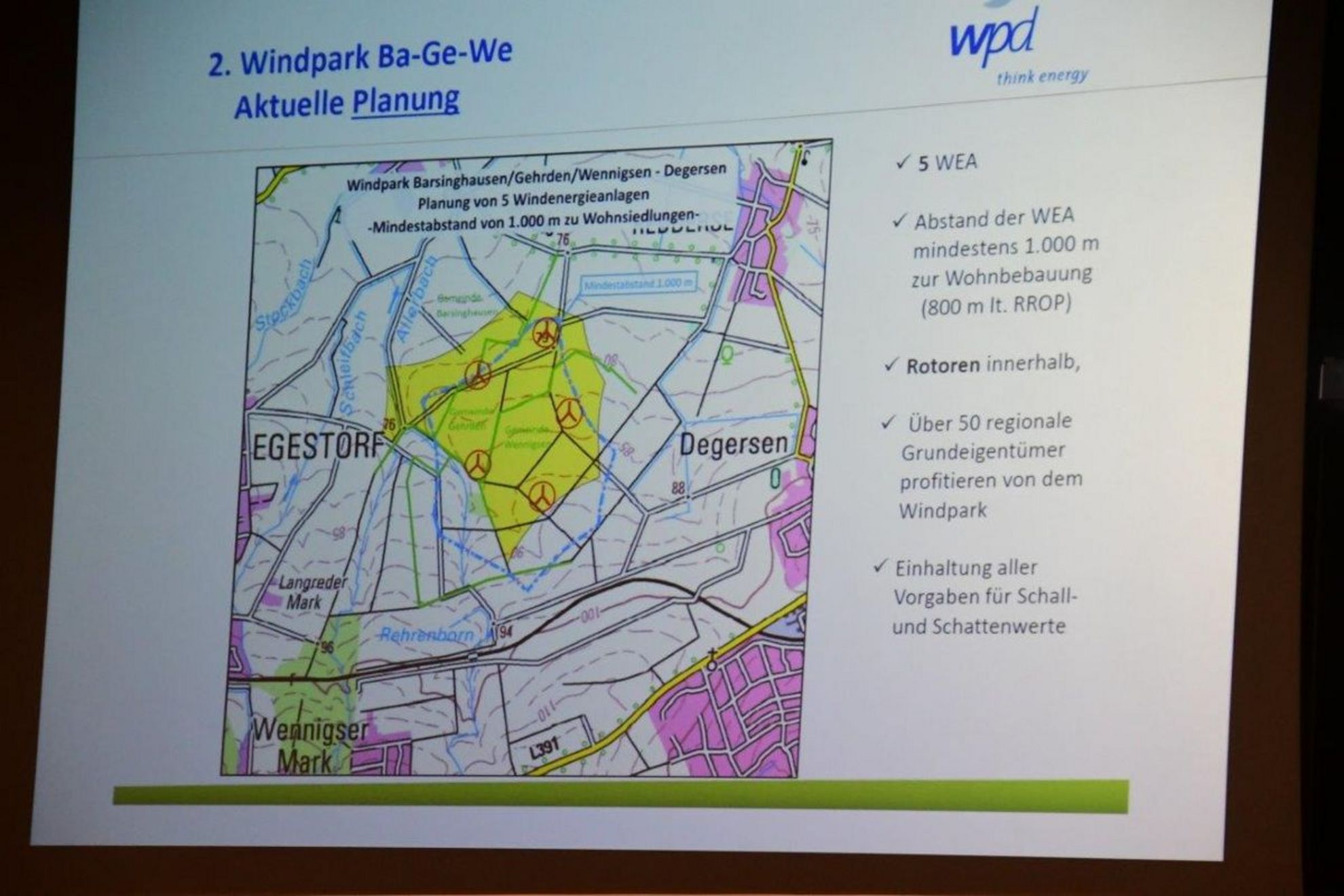 In der Sitzung des Bauausschusses hatte WPD, der zukünftige Betreiber des Windparks in der Langreder Mark, neue überarbeitete Pläne vorgestellt. Bereits auf einer Veranstaltung der Klimaschutzagentur Region Hannover hatte Daniel Kurreck von wpd den Bürgern einen Kompromiss angeboten. Auch im Bauausschuss versuchten der wpd Niederlassungsleiter Holger Groß und der Projektleiter Heinz Herbot gute Stimmung für den Windpark zu machen. Dies gelang aber kaum. Viele Besucher der Sitzung machten ihren Unmut laut und stellten Fragen an die zukünftigen Betreiber des Windparks, die aber größtenteils unbefriedigend für die Bürger beantwortet wurden. Nach wie vor sprechen sich die Anwohner unter anderem gegen die geplante Höhe von 250 Metern, den entstehenden Schalllärm sowie die unvorhersehbaren Auswirkungen des Infraschalls aus. Insbesondere Letzteres sorgte für massive Unmutsäußerungen der Bürger. Niederlassungsleiter Groß argumentierte, dass nur mit der geplanten Höhe die Wirtschaftlichkeit der Anlage gegeben sei und dass man die notwendigen Schallschutzrichtlinien einhalten werde, da sonst eine Stilllegung des Windparks möglich wäre. Wenig stichhaltige Argumente konnte er allerdings gegen die Auswirkungen des Infraschalls hervorbringen. Für seine Aussage „Man dürfte dann auch kein Auto oder Eisenbahn mehr fahren“ wurden von der Mehrheit der Besucher nicht akzeptiert. Ganz nebenbei erfuhr man dann auch, dass pro Windrad rund 5.000 Quadratmeter Bodenfläche versiegelt werden.