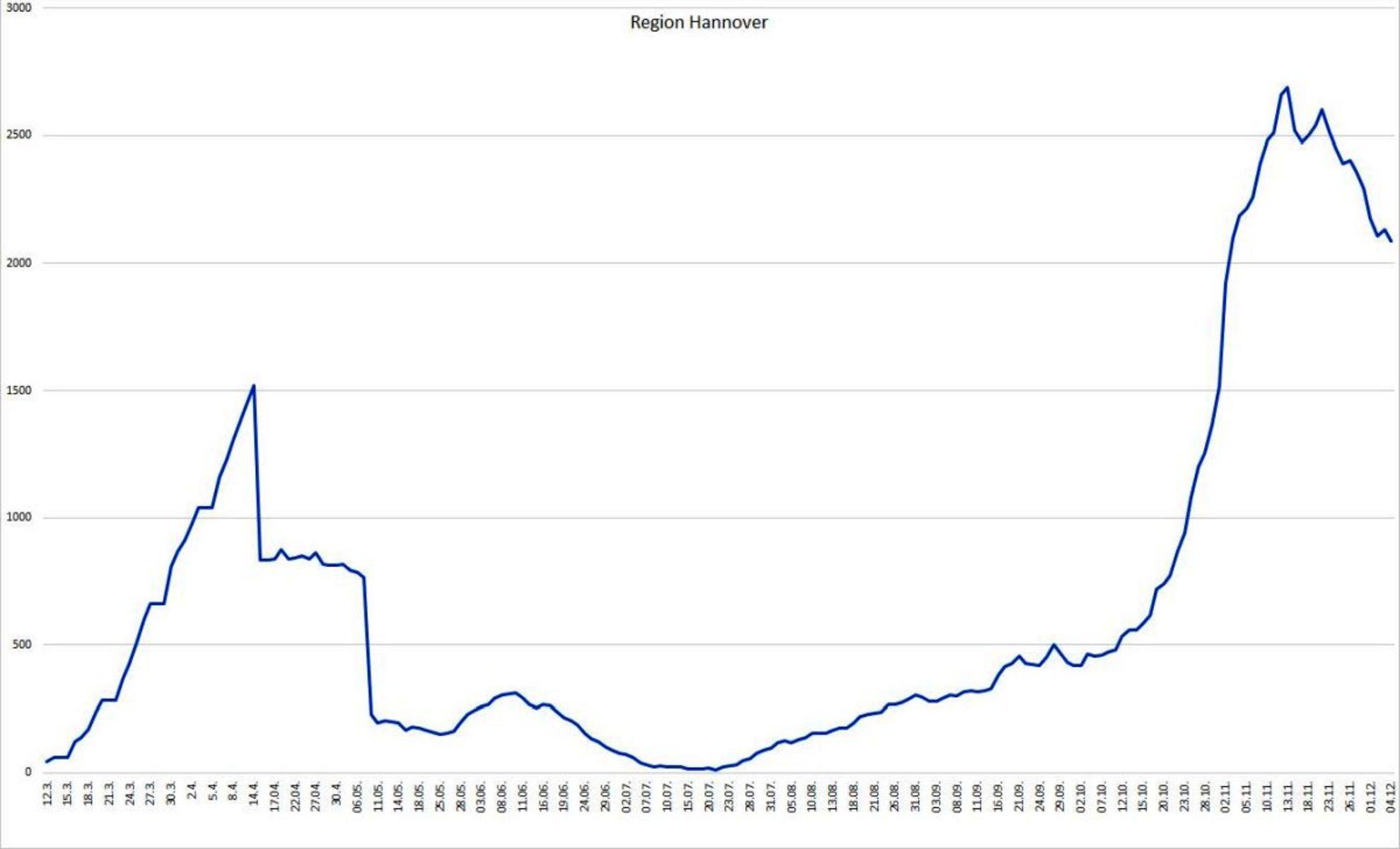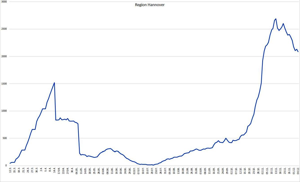Die Region Hannover hat seit Auftreten der ersten Corona-Infektion insgesamt 13.108 Menschen registriert, die sich in der Region mit dem Coronavirus infiziert haben. Davon sind zum heutigen Stand 10.796 Personen als genesen aufgeführt. 225 Menschen sind infolge einer nachgewiesenen oder mutmaßlichen Corona-Infektion in der Region verstorben; der Altersmedian der Verstorbenen liegt bei 84 Jahren. Somit sind zum jetzigen Zeitpunkt 2.087 Menschen in der Region infiziert. Die 7-Tages-Inzidenz pro 100.000 Einwohner liegt für die Region Hannover tagesaktuell bei 80,1.