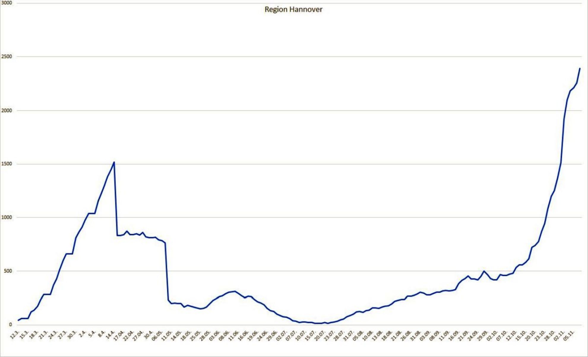 Die Region Hannover hat seit Auftreten der ersten Corona-Infektion insgesamt 8.490 Menschen registriert, die sich in der Region mit dem Coronavirus infiziert haben. Davon sind zum heutigen Stand 5.940 Personen als genesen aufgeführt. 157 Menschen sind infolge einer nachgewiesenen oder mutmaßlichen Corona-Infektion in der Region verstorben; der Altersmedian der Verstorbenen liegt bei 83 Jahren. Somit sind zum jetzigen Zeitpunkt 2.393 Menschen in der Region infiziert. Die 7-Tages-Inzidenz pro 100.000 Einwohner liegt für die Region Hannover tagesaktuell bei 107,3.
