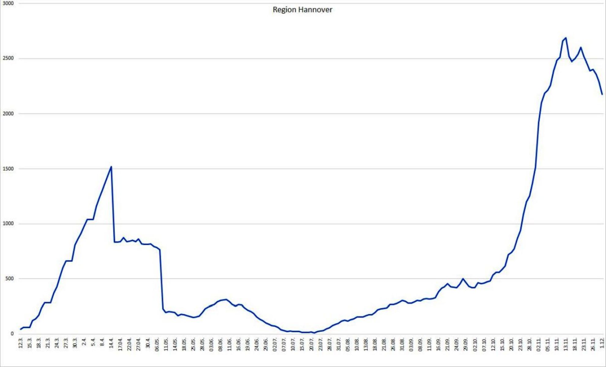 Die Region Hannover hat seit Auftreten der ersten Corona-Infektion insgesamt 12.560 Menschen registriert, die sich in der Region mit dem Coronavirus infiziert haben. Davon sind zum heutigen Stand 10.163 Personen als genesen aufgeführt. 216 Menschen sind infolge einer nachgewiesenen oder mutmaßlichen Corona-Infektion in der Region verstorben; der Altersmedian der Verstorbenen liegt bei 84 Jahren. Somit sind zum jetzigen Zeitpunkt 2180 Menschen in der Region infiziert. Die 7-Tages-Inzidenz pro 100.000 Einwohner liegt für die Region Hannover tagesaktuell bei 88,0.
