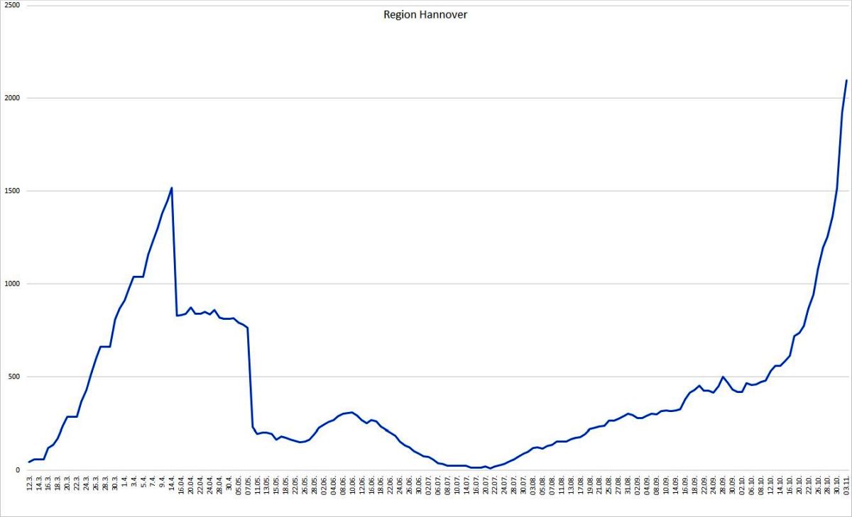 Die Region Hannover hat seit Auftreten der ersten Corona-Infektion insgesamt 7.463 Menschen registriert, die sich in der Region mit dem Coronavirus infiziert haben. Davon sind zum heutigen Stand 5.213 Personen als genesen aufgeführt. 152 Menschen sind infolge einer nachgewiesenen oder mutmaßlichen Corona-Infektion in der Region verstorben; der Altersmedian der Verstorbenen liegt bei 83 Jahren. Somit sind zum jetzigen Zeitpunkt 2098 Menschen in der Region infiziert. Die 7-Tages-Inzidenz pro 100.000 Einwohner liegt für die Region Hannover tagesaktuell bei 115,8.