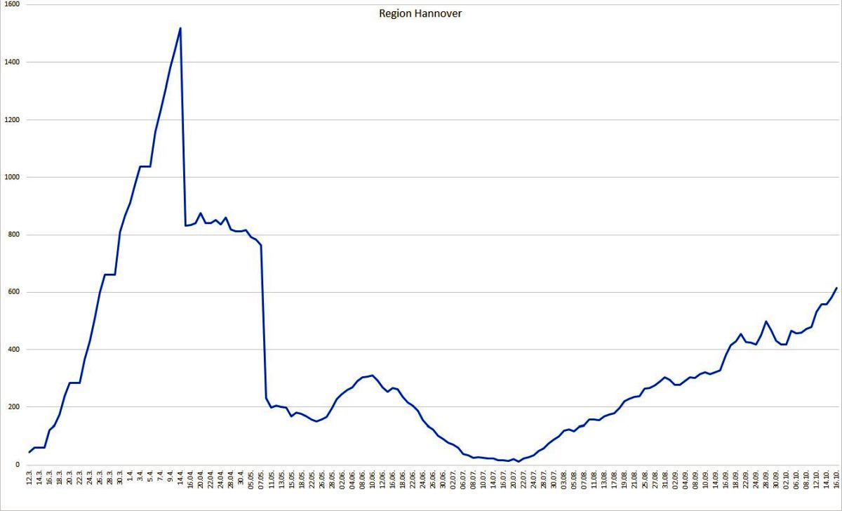 Die Region Hannover hat seit Auftreten der ersten Corona-Infektion insgesamt 5.064 Menschen registriert, die sich in der Region mit dem Coronavirus infiziert haben. Davon sind zum heutigen Stand 4.310 Personen als genesen aufgeführt. 139 Menschen sind infolge einer nachgewiesenen oder mutmaßlichen Corona-Infektion in der Region verstorben; der Altersmedian der Verstorbenen liegt bei 83 Jahren. Somit sind zum jetzigen Zeitpunkt 615 Menschen in der Region infiziert, davon befinden sich 34 Personen im Krankenhaus. Die 7-Tages-Inzidenz pro 100.000 Einwohner liegt für die Region Hannover tagesaktuell bei 31,9.