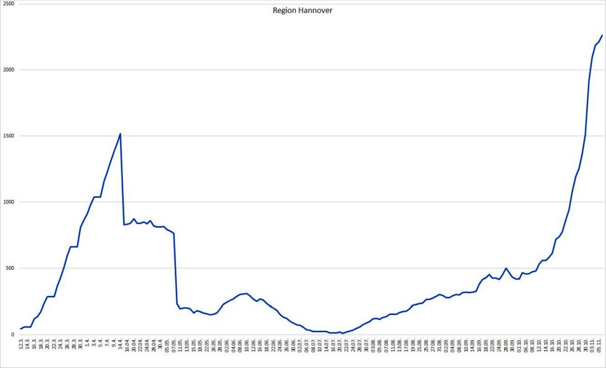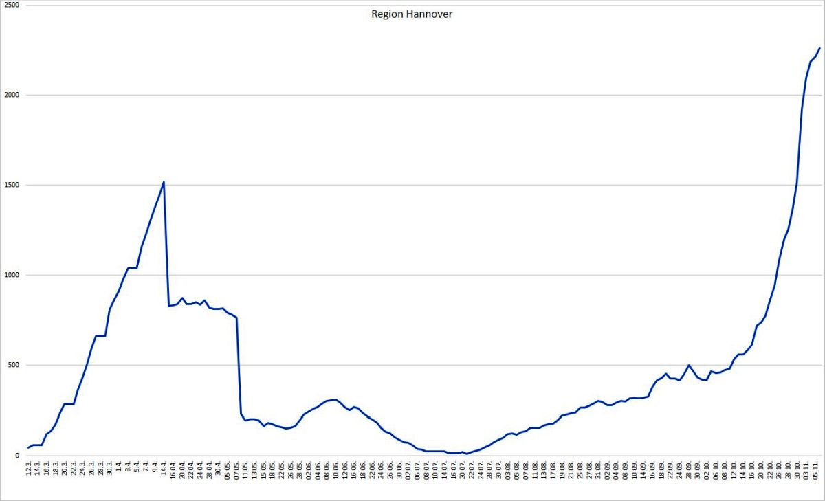 Die Region Hannover hat seit Auftreten der ersten Corona-Infektion insgesamt 8013 Menschen registriert, die sich in der Region mit dem Coronavirus infiziert haben. Davon sind zum heutigen Stand 5595 Personen als genesen aufgeführt. 157 Menschen sind infolge einer nachgewiesenen oder mutmaßlichen Corona-Infektion in der Region verstorben; der Altersmedian der Verstorbenen liegt bei 83 Jahren. Somit sind zum jetzigen Zeitpunkt 2261 Menschen in der Region infiziert. Die 7-Tages-Inzidenz pro 100.000 Einwohner liegt für die Region Hannover tagesaktuell bei 118,7.