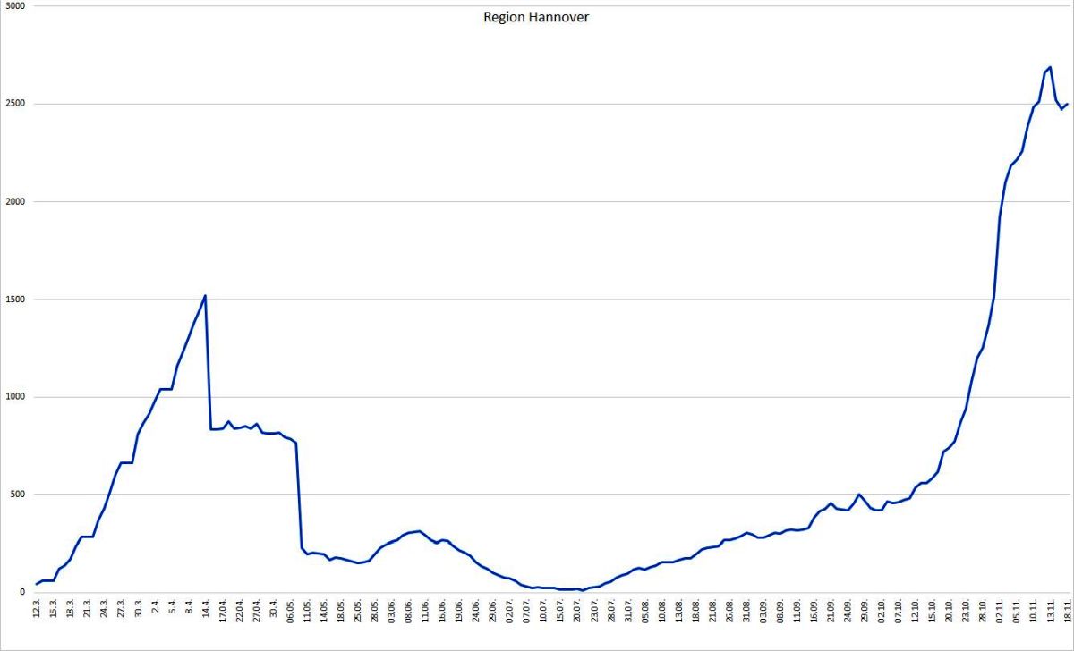 Die Region Hannover hat seit Auftreten der ersten Corona-Infektion insgesamt 10.382 Menschen registriert, die sich in der Region mit dem Coronavirus infiziert haben. Davon sind zum heutigen Stand 7.707 Personen als genesen aufgeführt. 178 Menschen sind infolge einer nachgewiesenen oder mutmaßlichen Corona-Infektion in der Region verstorben; der Altersmedian der Verstorbenen liegt bei 84 Jahren. Somit sind zum jetzigen Zeitpunkt 2.497 Menschen in der Region infiziert. Die 7-Tages-Inzidenz pro 100.000 Einwohner liegt für die Region Hannover tagesaktuell bei 106,9.