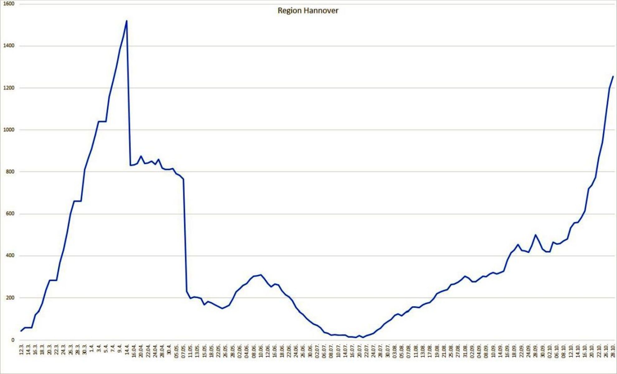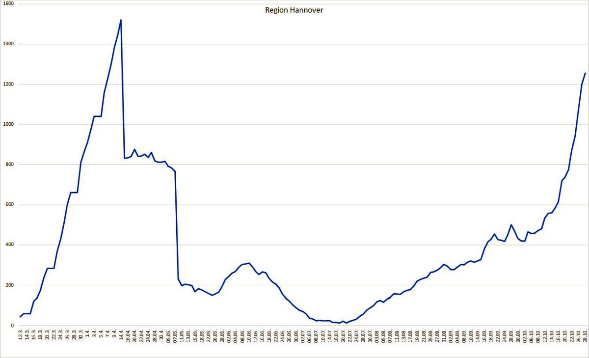 Die Region Hannover hat seit Auftreten der ersten Corona-Infektion insgesamt 6.212 Menschen registriert, die sich in der Region mit dem Coronavirus infiziert haben. Davon sind zum heutigen Stand 4.814 Personen als genesen aufgeführt. 144 Menschen sind infolge einer nachgewiesenen oder mutmaßlichen Corona-Infektion in der Region verstorben; der Altersmedian der Verstorbenen liegt bei 83 Jahren. Somit sind zum jetzigen Zeitpunkt 1.254 Menschen in der Region infiziert, davon befinden sich 28 Personen im Krankenhaus. Die 7-Tages-Inzidenz pro 100.000 Einwohner liegt für die Region Hannover tagesaktuell bei 69,6.