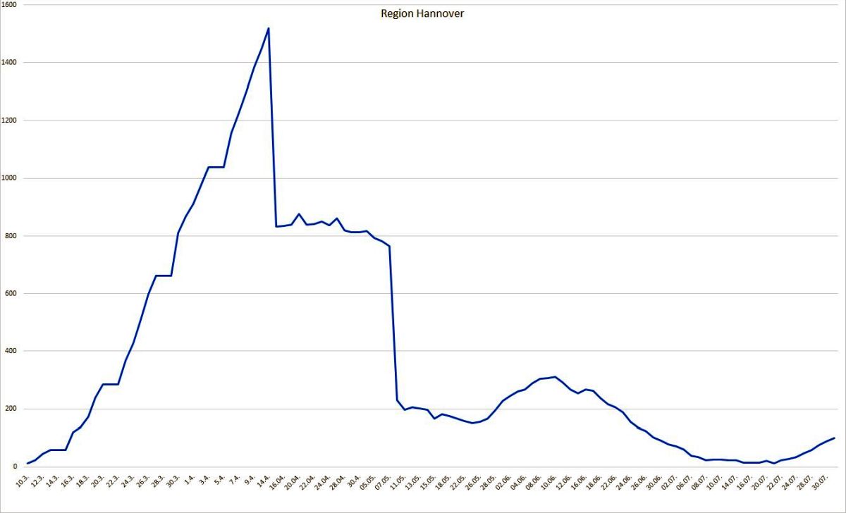 Die Region Hannover hat seit Auftreten der ersten Corona-Infektion insgesamt 2.906 Menschen registriert, die sich in der Region mit dem Coronavirus infiziert haben. Davon sind zum heutigen Stand 2.686 Personen als genesen aufgeführt. 120 Menschen sind infolge einer nachgewiesenen oder mutmaßlichen Corona-Infektion in der Region verstorben; der Altersdurchschnitt der Verstorbenen liegt bei 82 Jahren. Somit sind zum jetzigen Zeitpunkt 100 Menschen in der Region infiziert.