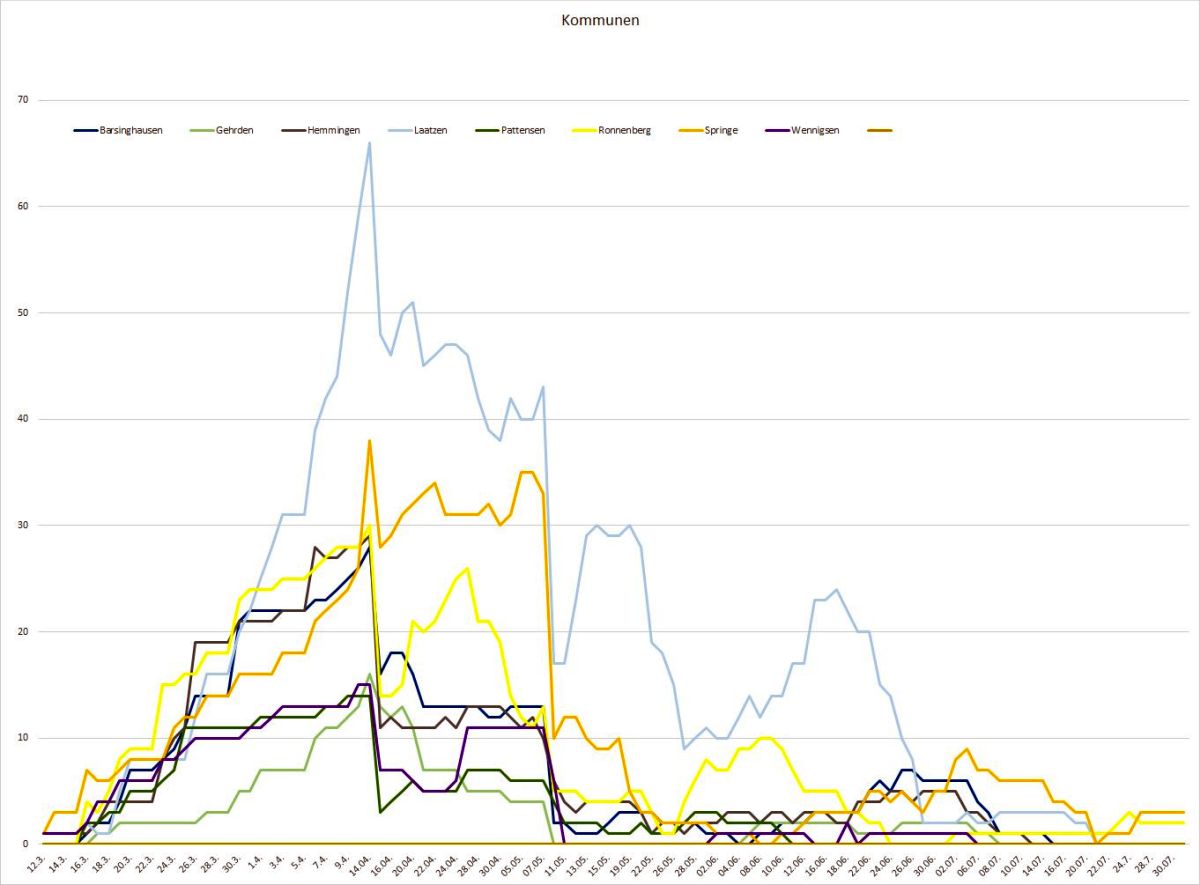 Hinsichtlich der steigenden Infektionszahlen weist die Region darauf hin, dass es sich derzeit um keinen einzelnen relevanten Infektionsherd handelt. Vielmehr resultieren die Zahlen überwiegend aus familiären Kontexten, gelegentlich auch im Zusammenhang mit einzelnen Reiserückkehrern. Nach Einschätzung des Gesundheitsamtes handelt es sich darüber hinaus um eine zunehmende Vernachlässigung der Abstands- und Hygieneregeln im privaten Bereich. Trotz gelockerter Gruppengrößen in der Öffentlichkeit oder bei der Anzahl von Gästen bei privaten Feiern, sollten diese Kontakte nach Empfehlung des Gesundheitsamtes weiterhin überschaubar bleiben, Abstands- und Hygieneregeln sollten auch dort so weit wie möglich eingehalten werden.