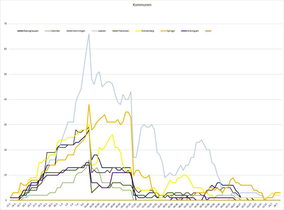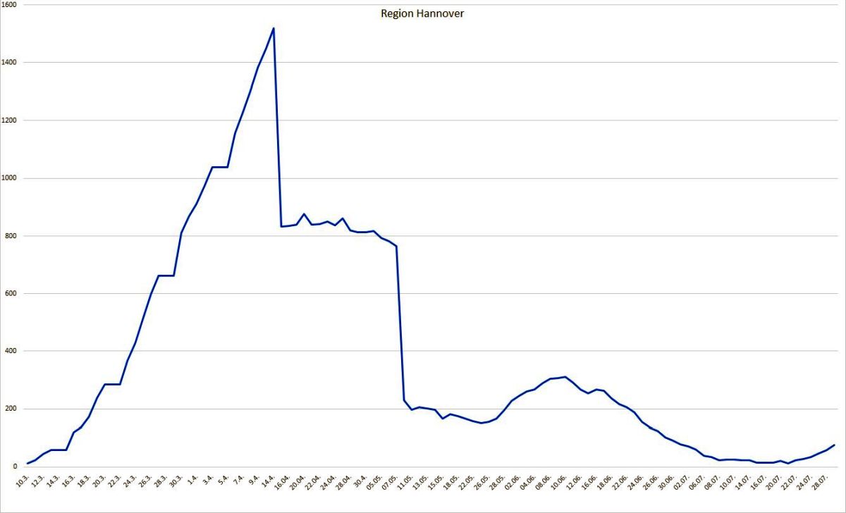 Die Region Hannover hat seit Auftreten der ersten Corona-Infektion insgesamt 2880 Menschen registriert, die sich in der Region mit dem Coronavirus infiziert haben. Davon sind zum heutigen Stand 2683 Personen als genesen aufgeführt. 120 Menschen sind infolge einer nachgewiesenen oder mutmaßlichen Corona-Infektion in der Region verstorben; der Altersdurchschnitt der Verstorbenen liegt bei 82 Jahren. Somit sind zum jetzigen Zeitpunkt 77 Menschen in der Region infiziert.