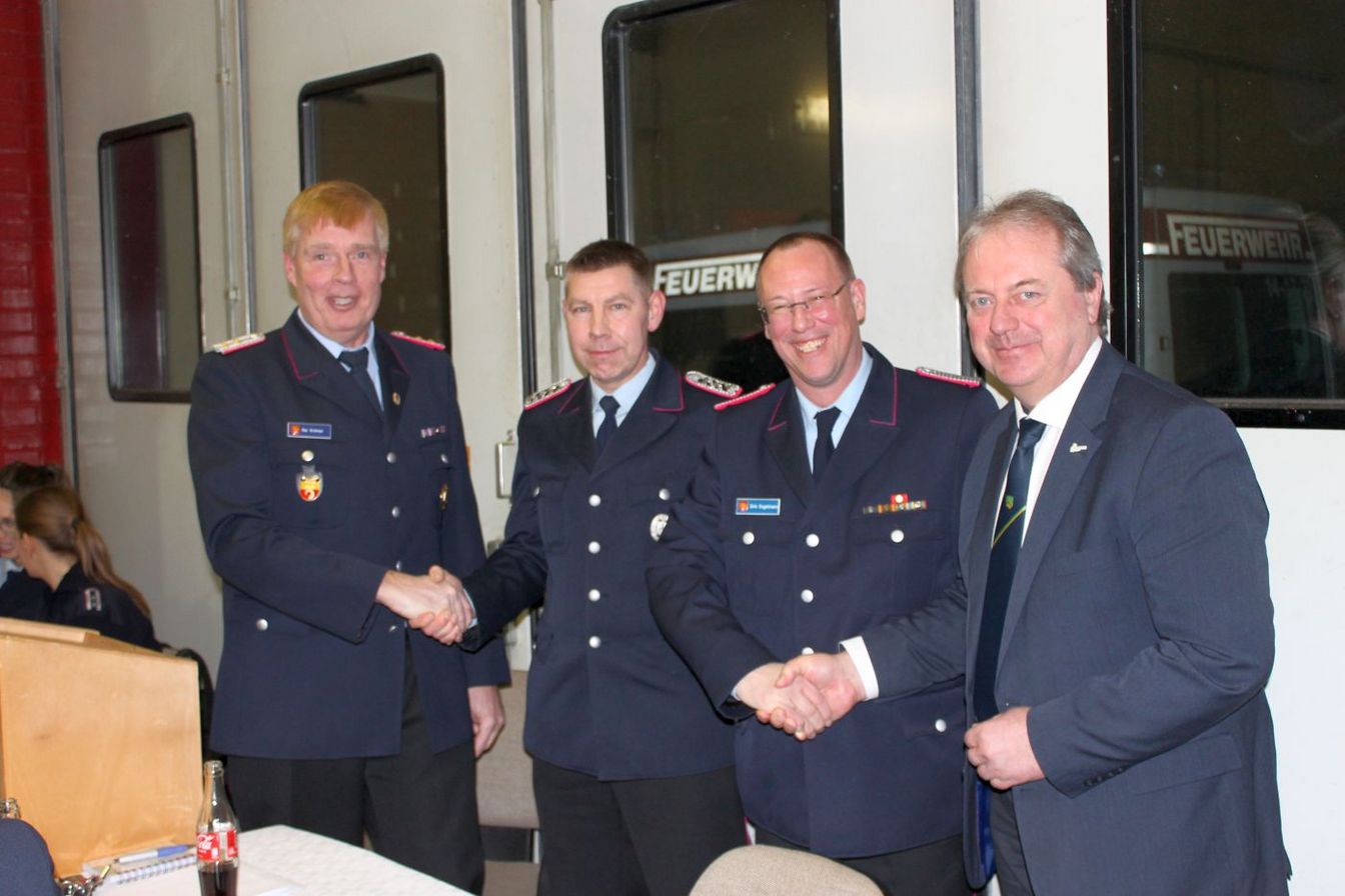 Ortsbrandmeister Dirk Engelmann begrüßte seine Kameraden, Vertreter aus Rat und Verwaltung und Bürgermeister Henning Schünhof zu Beginn der Versammlung. Die Schlüssel des neuen Feuerwehrhauses seien zwar schon übergeben worden, ein Einzug aber wohl erst im März möglich. Bei der Wahl zum Ortsbrandmeister und zum stellvertretenden Ortsbrandmeister stellten sich Engelmann und Achim Gäfke zur Wiederwahl und wurden von den aktiven Kameraden auch einstimmig gewählt. „Ich bedanke mich für das erneute Vertrauen“, so Ortsbrandmeister Engelmann nach dem Wahlgang, „Ich bin mir sicher, dass wir das gemeinsam schaffen werden und die nächsten sechs Jahre genauso schön werden wie die letzten sechs Jahre.“ Auch die Wahl des Kommandos verlief einstimmig.