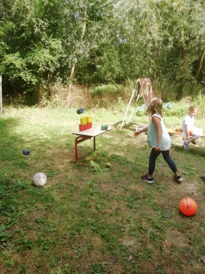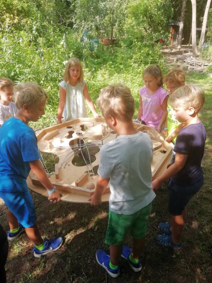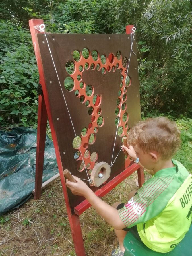 Der Labyrinthtisch (ein Unikat) fordert eine gute Koordination der gesamten Gruppe, um die Holzkugel vom Start sicher über die vielen Fallen bis zum Ziel rollen zu lassen. Dann über die Hindernisse spazieren, laufen, vorwärts, rückwärts, balancieren, auf einem Bein lange stehen, mit den Füßen bei verbundenen Augen auf dem Fühlweg die Untergründe ertasten. Gute Punkte wurden auch beim Torwandschießen und bei weiteren Wurfspielen erreicht. Schließlich höchste Konzentration am Heißen Draht: Möglichst lange sollte die Öse berührungsfrei am Draht entlang geführt werden. Für die größeren Kinder gab es auf Wunsch noch die besonderen Spaßfahrräder: Mehrere Tandems für zwei und drei Radlerinnen sowie ein großes Dreirad – alle nicht so einfach zu steuern. Und dann das „unmögliche Mountainbike“, es sieht zwar normal aus – aber keiner kann es fahren, denn es ist eine Spezialkonstruktion, die falsch herum lenkt. Alle erhielten für ihre Leistungen eine Urkunde und als Verpflegung für die „lange“ Rückreise zum Outdoor-Camp eine Tüte frisches Popcorn.