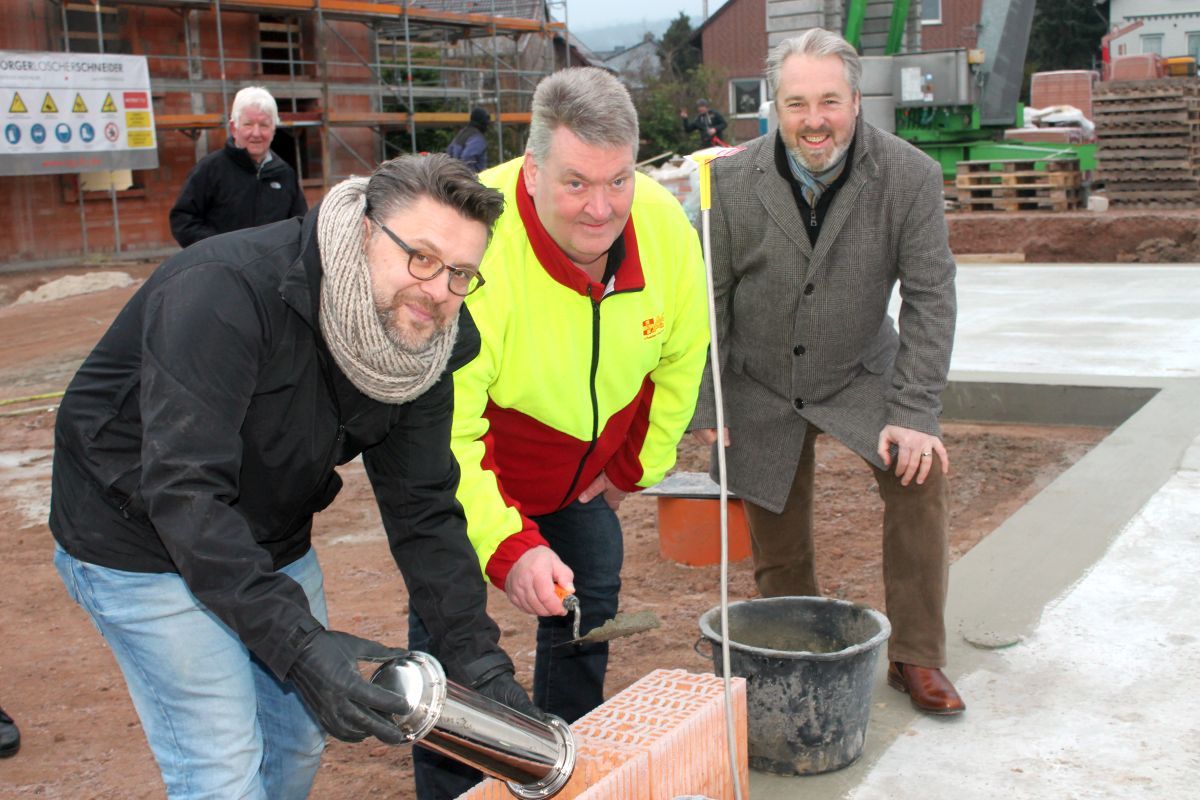 Erster Stadtrat Thomas Wolf, Jens Meier und Torsten Schneider, Investor/Ingenieur, vergruben gemeinsam die Zeitkapsel. In ihr sind eine Tageszeitung, Münzen, Baugenehmigung und der Vertrag enthalten.
