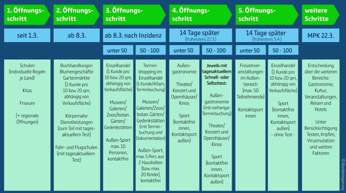 So soll ab dem 8. März der zweite Schritt der Öffnungen folgen, wenn die Inzidenz stabil bleibt. Buchhandlungen, Blumengeschäfte und Gartenmärkte sollen im zweiten Schritt öffnen dürfen. Auch körpernahe Dienstleistungen sowie Fahr- und Flugschulen sollen mit entsprechenden Hygienekonzepten wieder öffnen können.