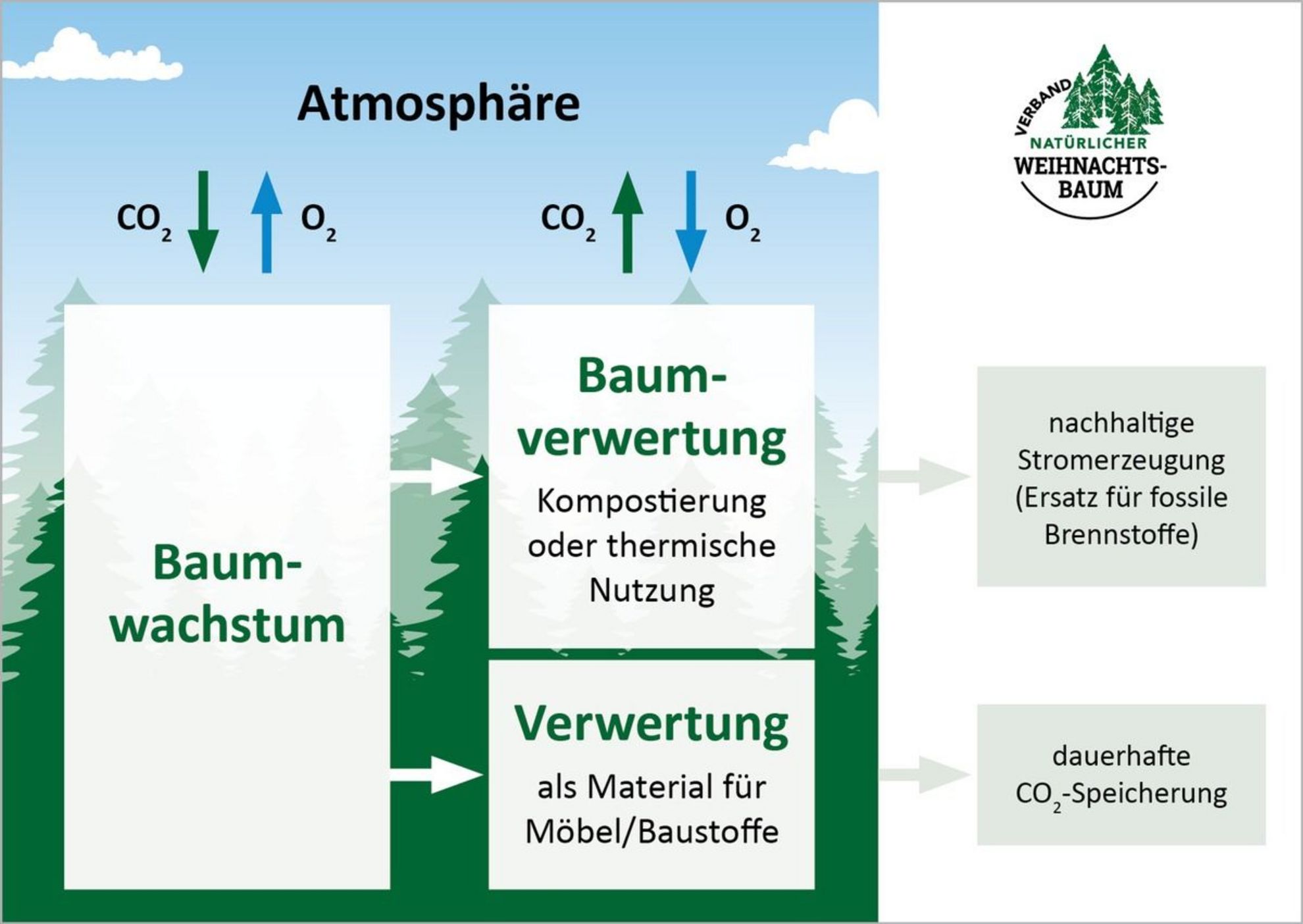 Grundsätzlich hat jeder Baum eine ausgeglichene CO2-Bilanz in seinem Lebenszyklus: Während des Wachstums spaltet der Baum Kohlendioxid aus der Luft durch Photosynthese in Kohlenstoff und Sauerstoff. Den Kohlenstoff nutzt der Baum zum Wachstum und speichert ihn in Stamm und Ästen. Den Sauerstoff gibt der Baum an die Atmosphäre ab. Stirbt der Baum, wird das vorher gespeicherte CO2 wieder an die Atmosphäre zurückgegeben. Die CO2-Bilanz des Baumes - auch des Weihnachtsbaums - bleibt also grundsätzlich ausgeglichen und klimaneutral.