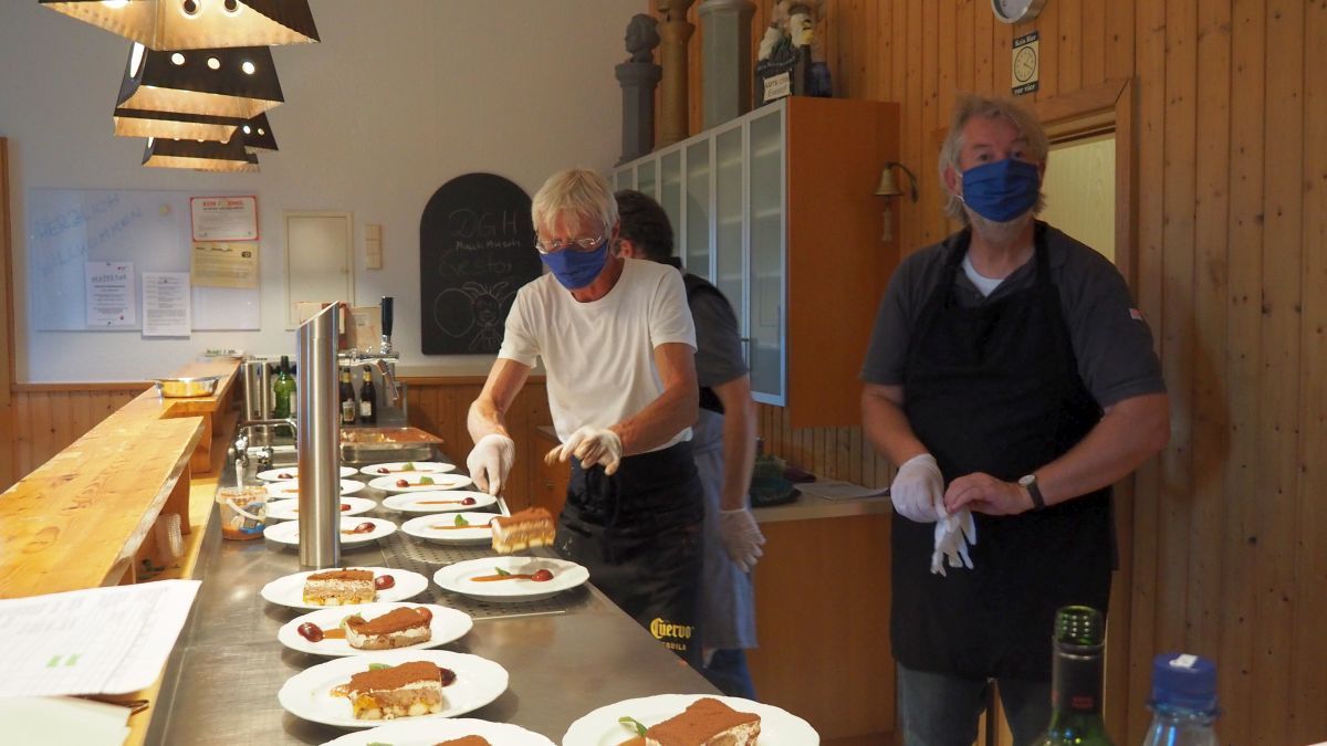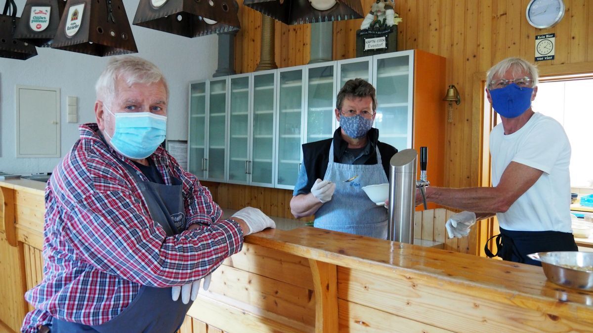 Am 6. September kamen 19 Gäste, um sich von den Köchen Hartmut Falkenberg, Bernhard Klingelhöfer, Harm Kolberg, Peter Meier verwöhnen zu lassen. Doch zunächst waren natürlich die Aha-Regeln das Thema: Einbahnstraßenregelung, Abstand der Tische, Mundschutz auch in der Küche, regelmäßige Desinfektion usw. Die Gäste zeigten sich sehr zufrieden mit den getroffenen Vorsichtsmaßnahmen. Und so konnte mit dem gebührenden Abstand auch das italienische Menü genossen werden: Salat mit Lachstreifen, Tortellini mit Sahnesoße und Tiramisu als Dessert zauberten zufriedene Gesichter bei den Gästen. Und als besonderen Service lieferten die Köche einem bettlägerigen Stammgast das Menü sogar ins Haus.