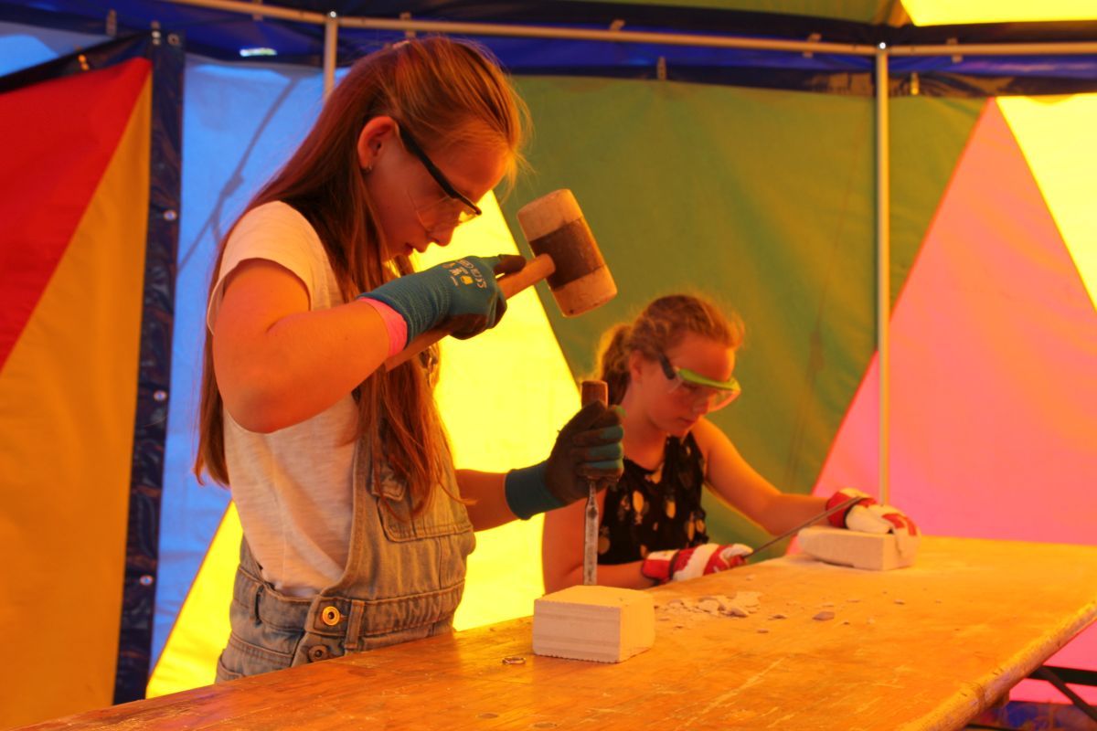 Nebenan im Kreativzelt sind Hammerschläge, das Kratzen von Sägen und das Schaben von Feilen zu hören, während andere Kinder Herzen und Sterne aus Teig ausstechen.