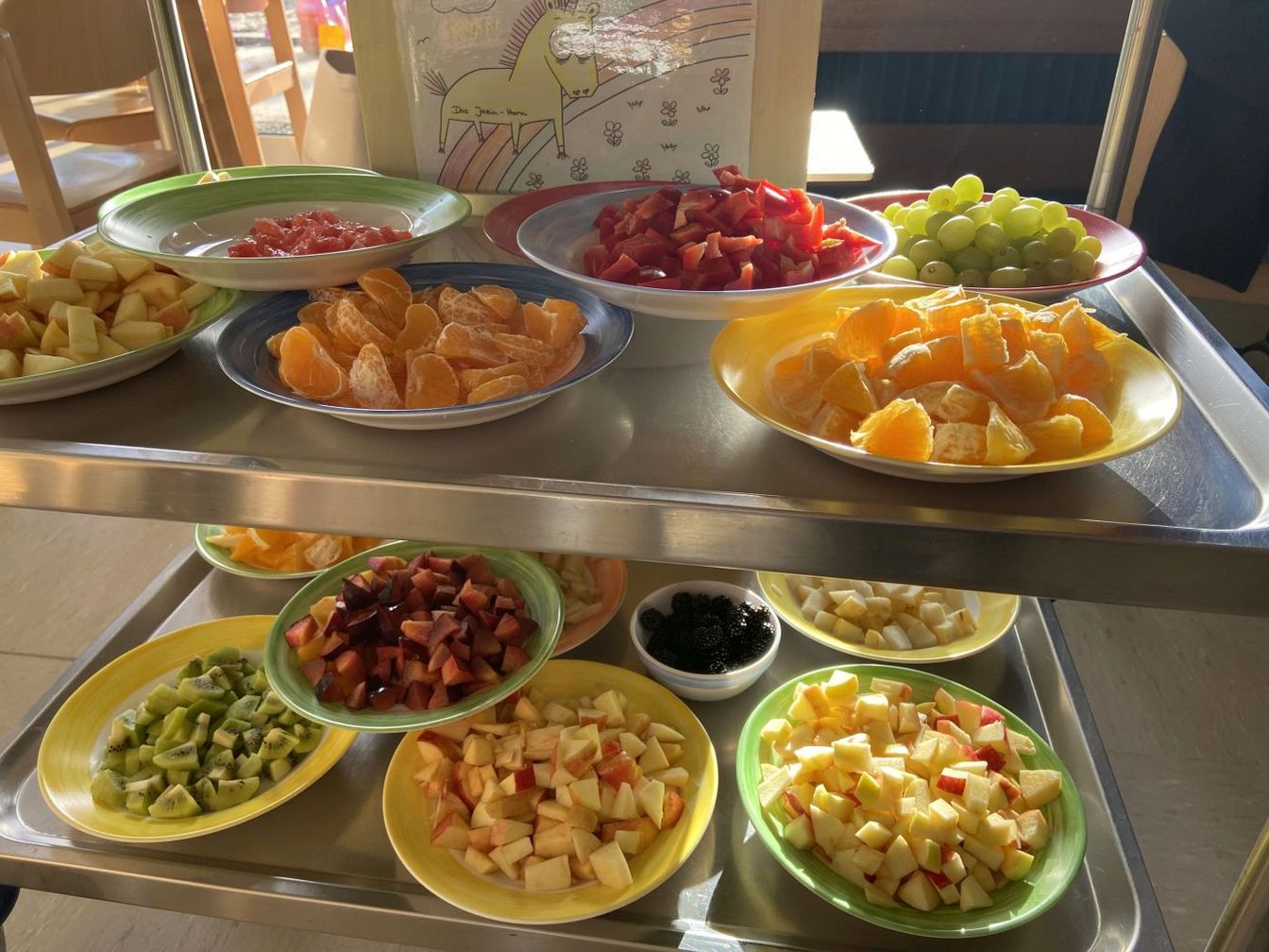 „Wir fanden die Idee sofort gut und unterstützen die Azubis daher gerne“, freut sich Kita-Leiterin Heidi Weiß, „Wir machen regelmäßig einen Obst & Gemüse-Tag, weshalb uns das gut gepasst hat.“ Die Azubis Lenny Sander, Pawel Lamparter, Mary-Anne Niemann, Melvin Geiger und Sophie Regenberg haben für jede der vier Kindergartengruppen eine große Kiste mit Obst und Gemüse aus dem eigenen Markt mitgebracht, damit die circa 100 Kinder auch ordentlich was zu schneiden haben – und dann ging es auch schon los. Fleißig zerschnitten die Kinder Paprika, Äpfel, Orangen, Mango, Ananas, Bananen und vieles mehr. „Darf ich auch schnippeln“, fragt ein Mädchen und natürlich dürfen alle helfen. Also Hände waschen und los ging es. „Am Anfang waren die Kinder noch etwas schüchtern, aber dann waren sie schnell voll dabei“, erzählt Auszubildende Mary-Anne. Azubi Melvin sagt: „Die wissen schon viel. Ich glaube sogar mehr, als wir früher über Obst usw. wussten.“