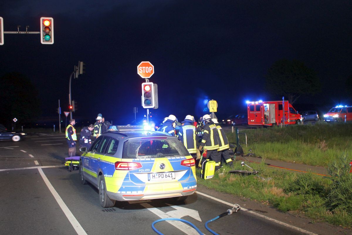 Wie Feuerwehr und Polizei vor Ort gegenüber con-nect mitteilten, war ein dunkelgrüner Renault Clio von Bad Nenndorf in Richtung Hannover unterwegs. Der Fahrer fuhr über die rote Ampel und kollidierte mit einem schwarzen Passat, welcher von Landringhausen in Richtung Barsinghausen unterwegs war. Beide Fahrzeuginsassen wurden bei dem Unfall verletzt. Wie schwer die Verletzungen sind ist derzeit noch unklar. Allerdings war der Fahrer des Renault nicht wie gemeldet eingeklemmt. Mit einem Spreizer öffneten die Feuerwehrleute die Wagentür und befreiten den Fahrer. Beide Fahrer wurden in Rettungswagen gebracht. Die Polizei sperrte die Fahrbahn ab, dies hinderte einzelne PKW´s nicht daran, trotzdem die Kreuzung zu überfahren und zwischen den Feuerwehrfahrzeugen hindurch zu fahren.
