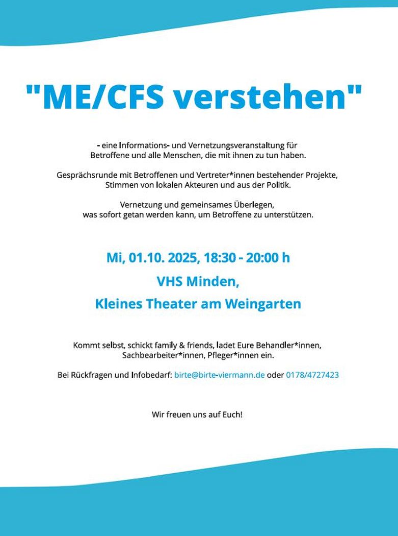Minden. Am Mittwoch, den 1. Oktober 2025, findet in Minden eine Informations- und Vernetzungsveranstaltung zum Thema ME/CFS statt. Von 18:30 bis 20:00 Uhr lädt die VHS Minden ins Kleine Theater am Weingarten ein, um Betroffenen eine Stimme zu geben und das Bewusstsein für diese oft unterschätzte Erkrankung zu stärken..