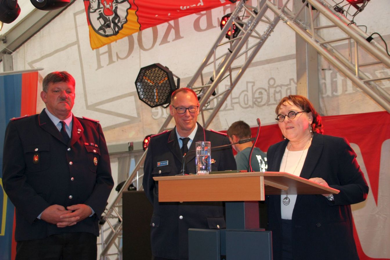 Landtagsabgeordnete Claudia Schüßler dankte nicht nur den Feuerwehrleuten für ihren Einsatz, sondern auch den Familien im Hintergrund, die zurückstecken müssten, wenn die Sirene auch in der Freizeit zum Einsatz ruft. „Dieses Fest an diesem Wochenende zeigt, wie wichtig die Freiwillige Feuerwehr für die Gesellschaft ist.“