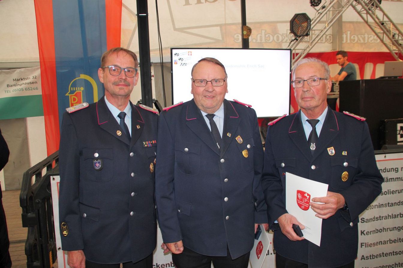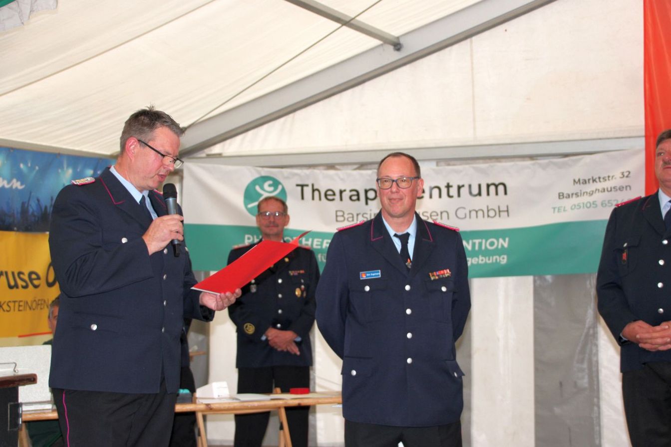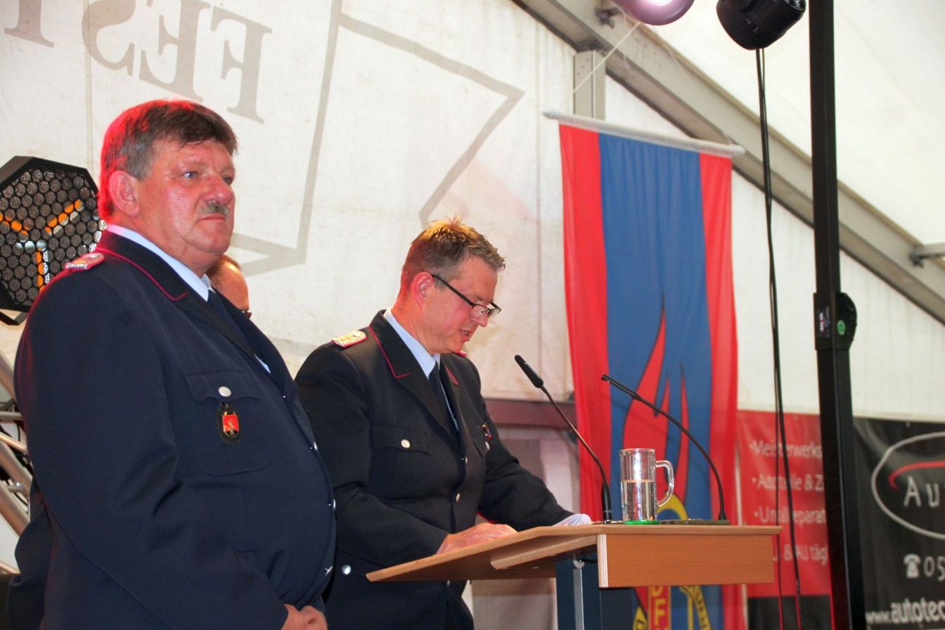 Ralf Buch, stellv. Stadtbrandmeister, lobte den Zusammenhalt und die Gemeinschaft der beiden Ortswehren über die je 90 Jahre. „Das gemeinsame Feuerwehrhaus und die Kinderfeuerwehr zeigen diesen Zusammenhalt sehr deutlich.“ Gemeinsam würden Einsätze im Ort, auf der B 65 und aufgrund des Küchenwagens auch gemeinsam mit der Regionsfeuerwehr geleistet. „Ihr seid immer da, wenn man euch braucht.“ Er dankte auch dem Goltener Musikzug, der über die Ortsgrenzen hinaus bekannt und geschätzt sei. „Lasst uns bei dem Fest nun innehalten und stolz zurückschauen, bevor der Blick dann wieder auf die Zukunft gerichtet wird.“
