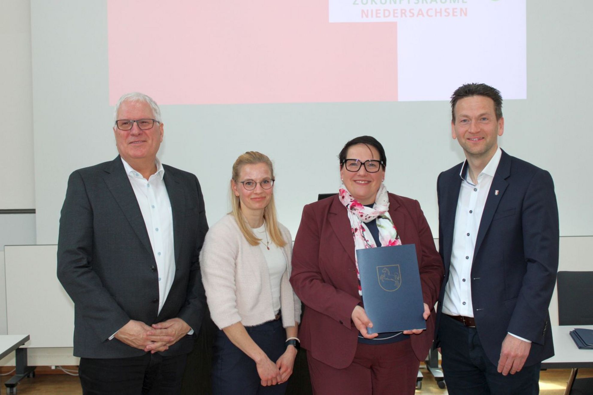 Bescheidübergabe an Gehrden: (v.l.) Ottmar von Holtz, Landesbeauftragter Amt für regionale Landesentwicklung, Melanie Rusteberg (Stadt Gehrden), Bürgermeister Malte Losert und Ministerin Melanie Walter.