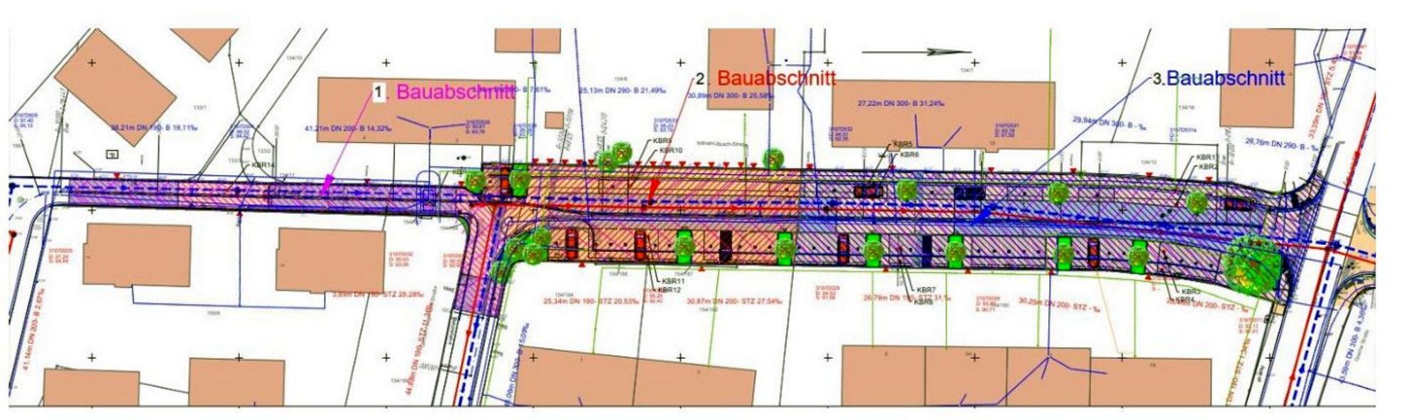 Um die Belastungen für die Anwohnerinnen und Anwohner so gering wie möglich zu halten, erfolgt die Baumaßnahme in drei aufeinanderfolgenden Bauabschnitten. Diese werden jeweils vollständig abgeschlossen, bevor der nächste Abschnitt beginnt. Während der Bauzeit müssen die einzelnen Abschnitte für den Kraftfahrzeugverkehr voll gesperrt werden. Die Erreichbarkeit zu Fuß bleibt jedoch durchgehend gewährleistet.
