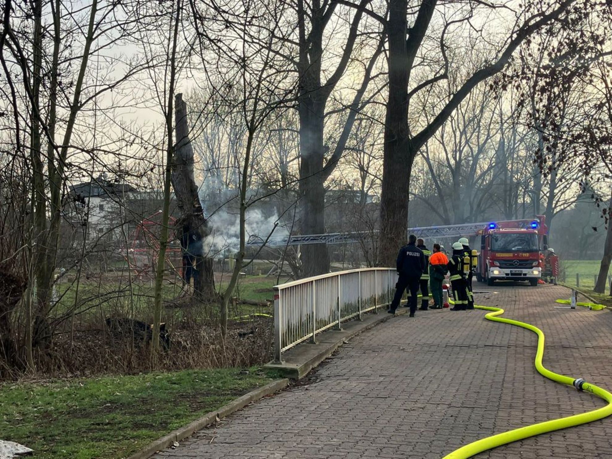 Da sich das Feuer nicht ohne weiteres löschen ließ, kam zusätzlich die Drehleiter der Ortsfeuerwehr Arnum zum Einsatz. Aus ungeklärter Ursache brannte ein bereits abgestorbener Baum auf der gesamten Höhe von gut 5 Metern im Inneren. Nachdem die Restkrone abgetragen war, wurde der Stamm gefällt und am Boden liegend zerkleinert und abgelöscht. Der Einsatz war gegen 17 Uhr beendet.  Die Höhe des Sachschadens ist momentan nicht zu beziffern. .