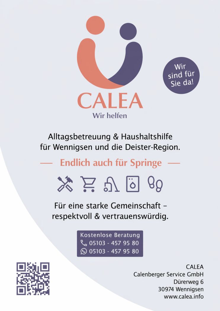 -Anzeige- Nach dem erfolgreichen Start in Wennigsen gibt es nun auch in Springe ein Angebot, das älteren Menschen und ihren Familien den Alltag erleichtert: CALEA. Das Unternehmen wurde mit dem Ziel gegründet, Menschen so zu unterstützen, dass sie möglichst lange selbstbestimmt in ihrem vertrauten Zuhause leben können – und gleichzeitig das Miteinander in der Region gestärkt wird.