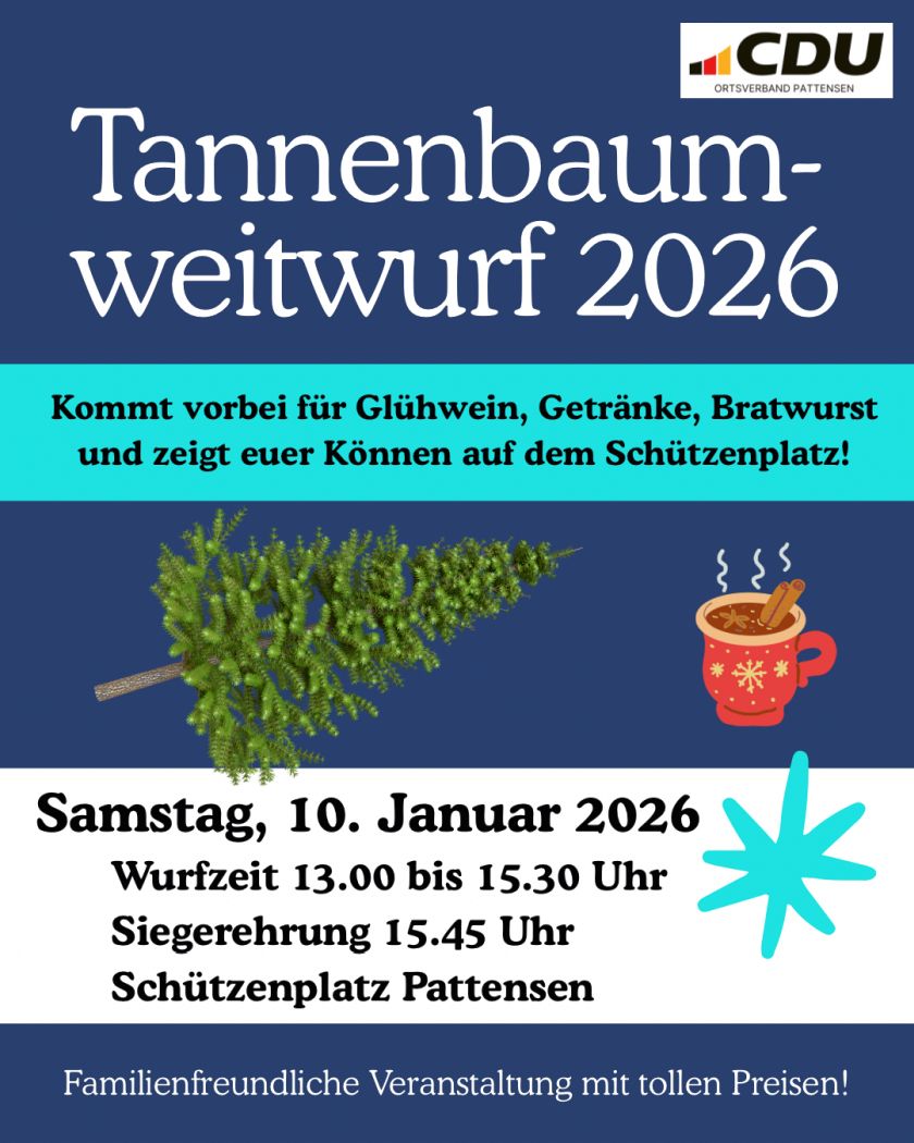 Pattensen. Nach der erfolgreichen Premiere im Januar 2025 heißt es am Samstag, 10. Januar 2026, wieder: Anlauf nehmen, Baum packen, weit werfen! Der CDU-Ortsverband Pattensen/Reden lädt erneut zum Weihnachtsbaumweitwurf auf den Schützenplatz Pattensen ein.